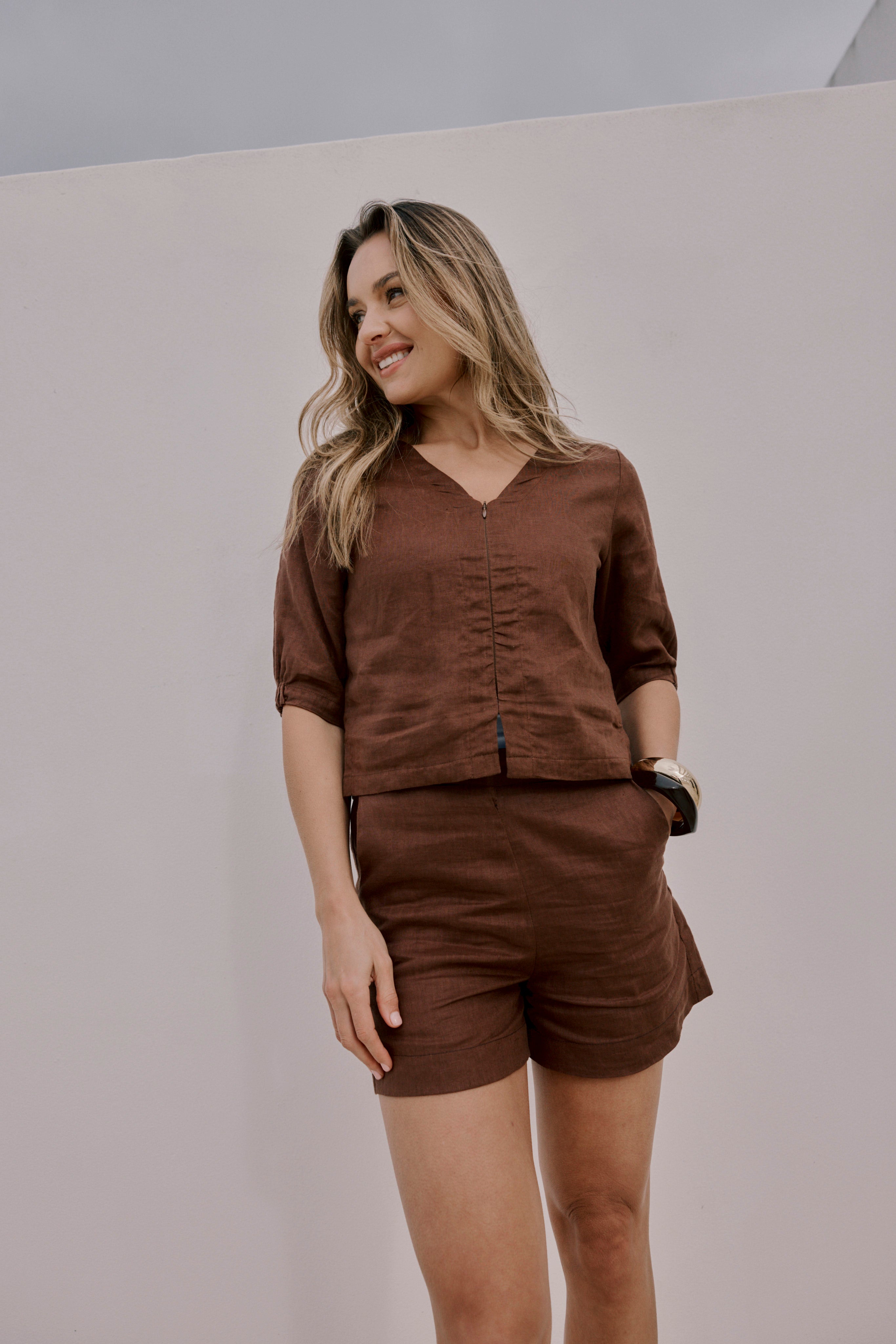 Cropped reversible top with front zipper closer, slits on the side and elastic details on the ¾ sleeves.