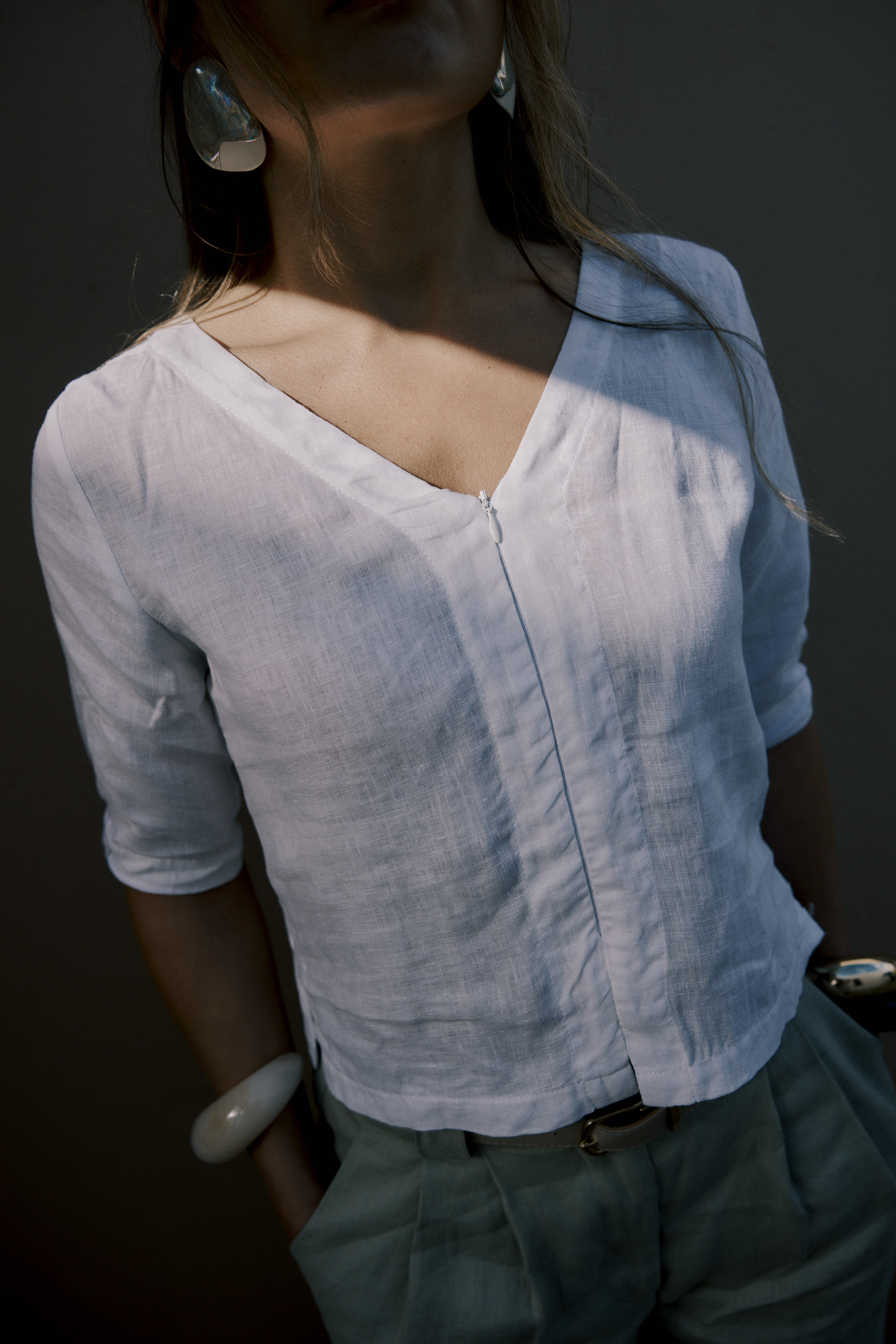 Cropped reversible top with front zipper closer, slits on the side and elastic details on the ¾ sleeves.