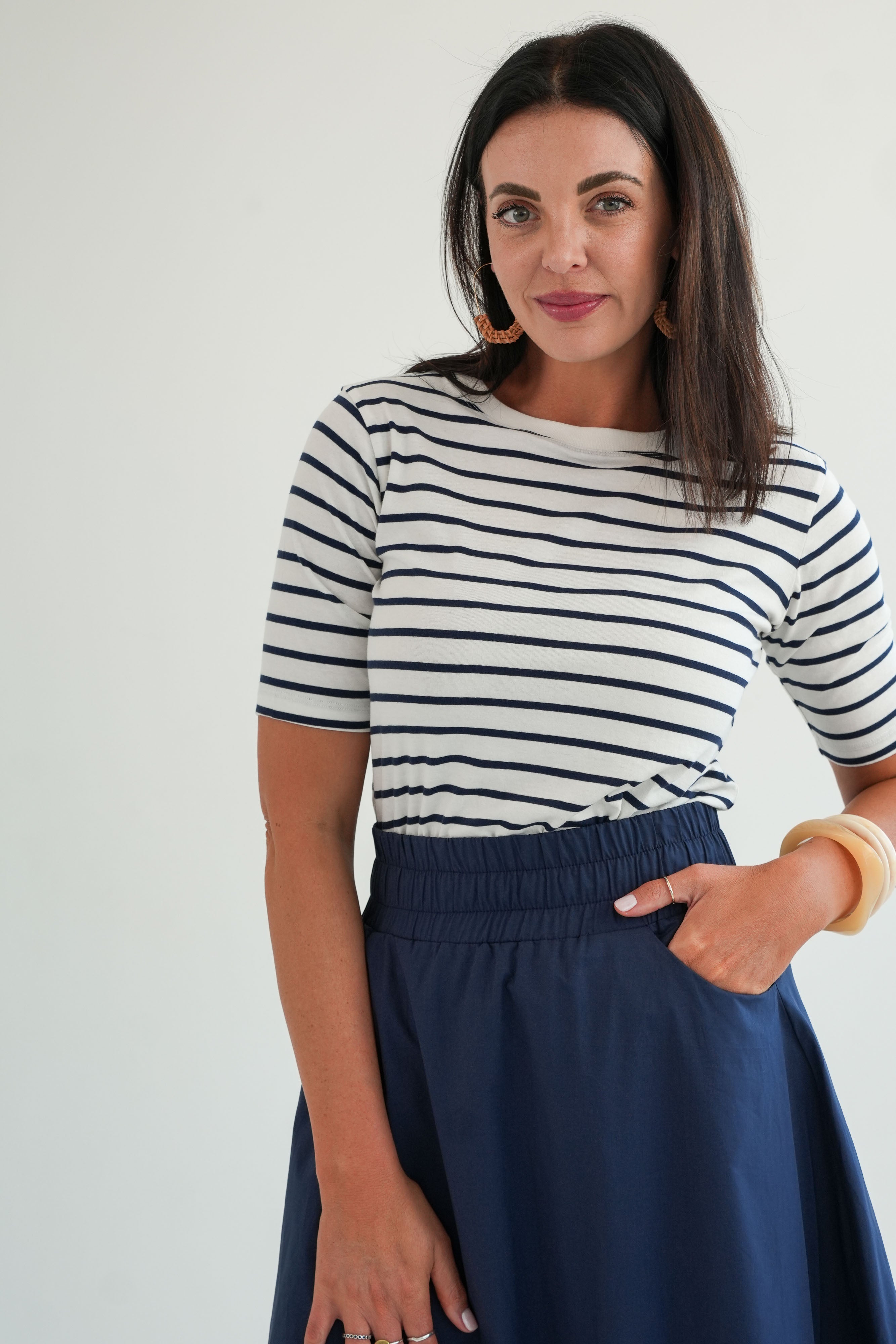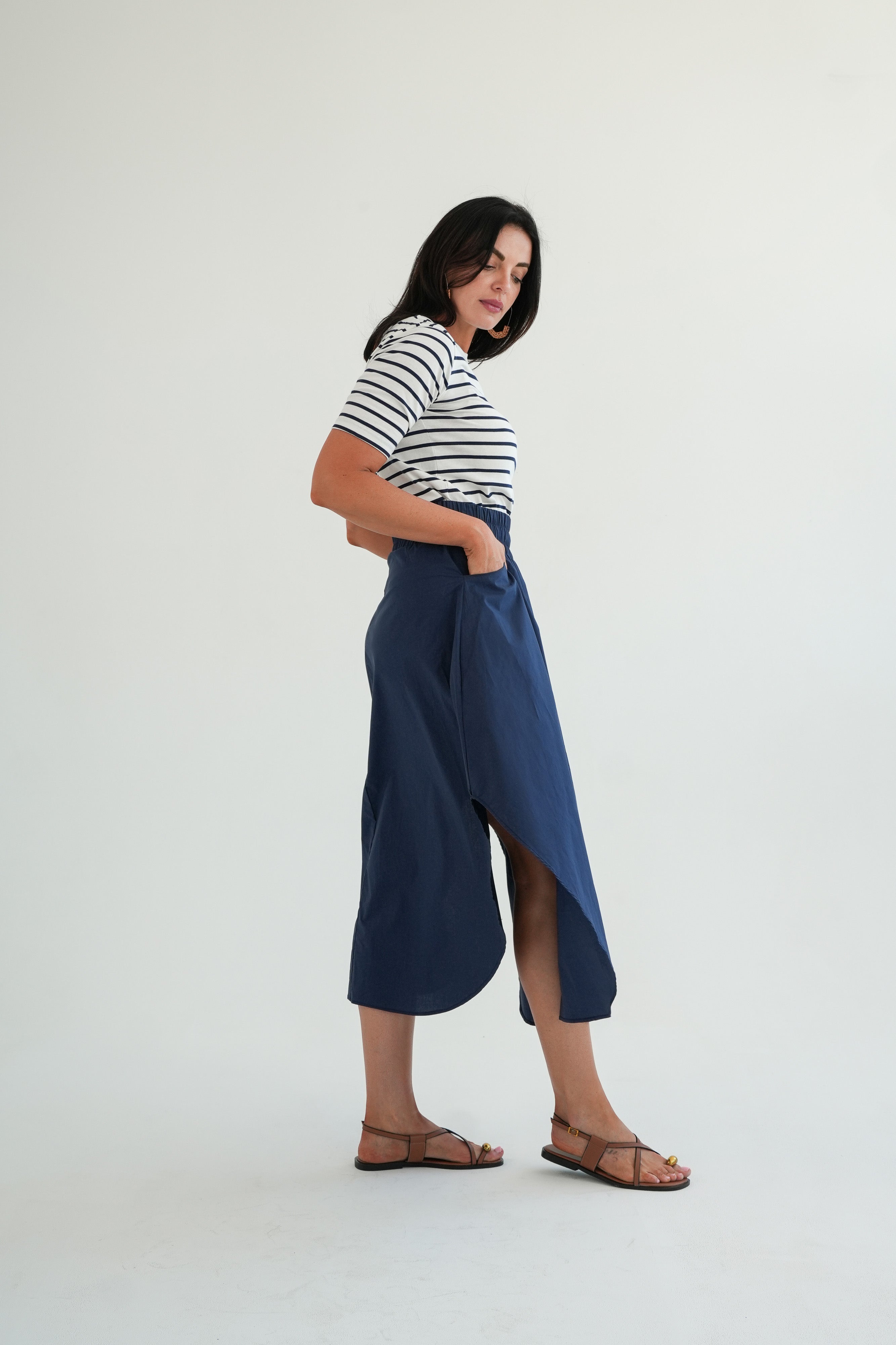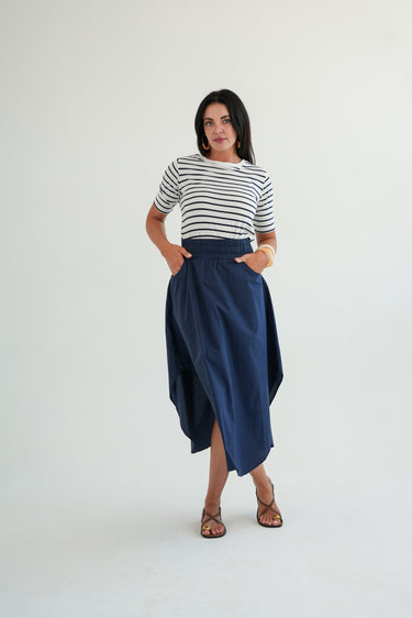 Ankle length skirt with a thick elasticated waistband, exaggerated curved hem and pockets.
