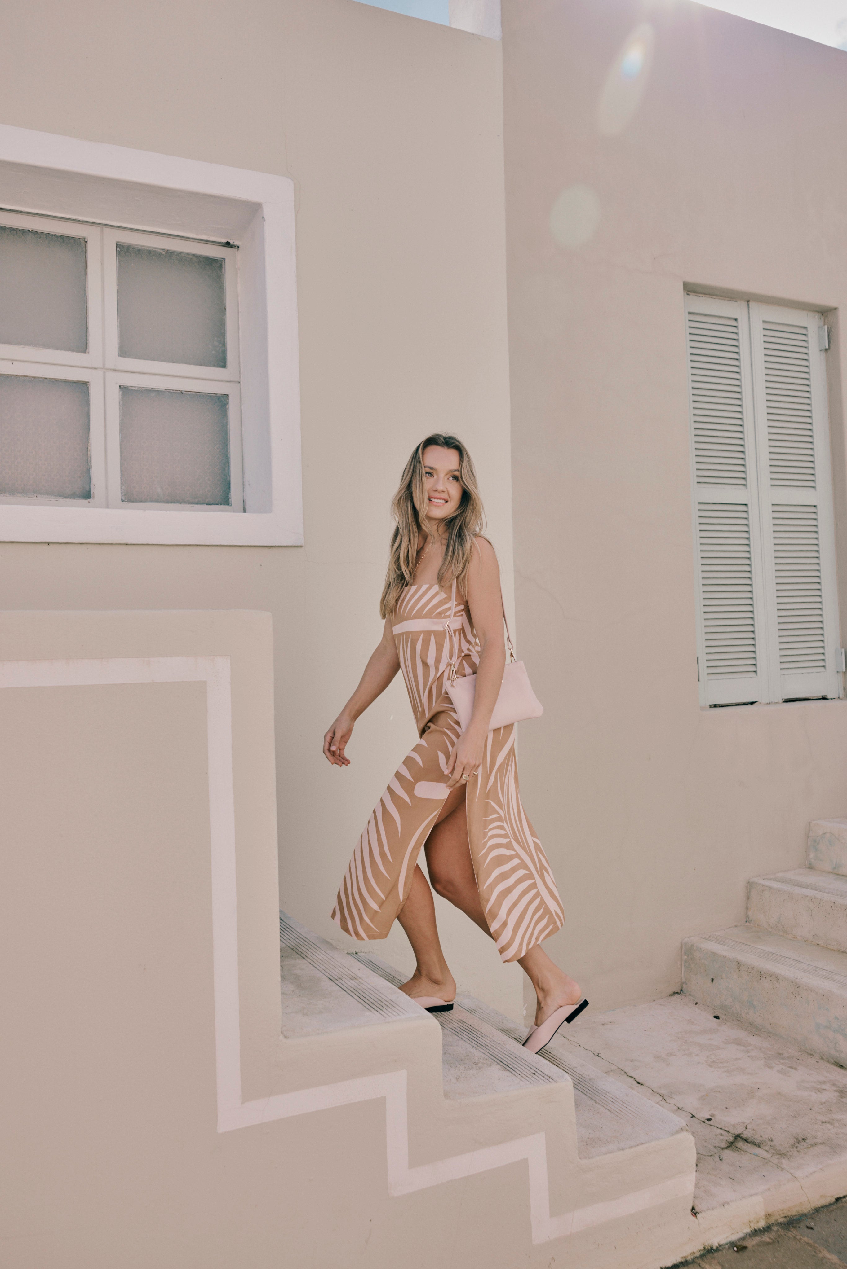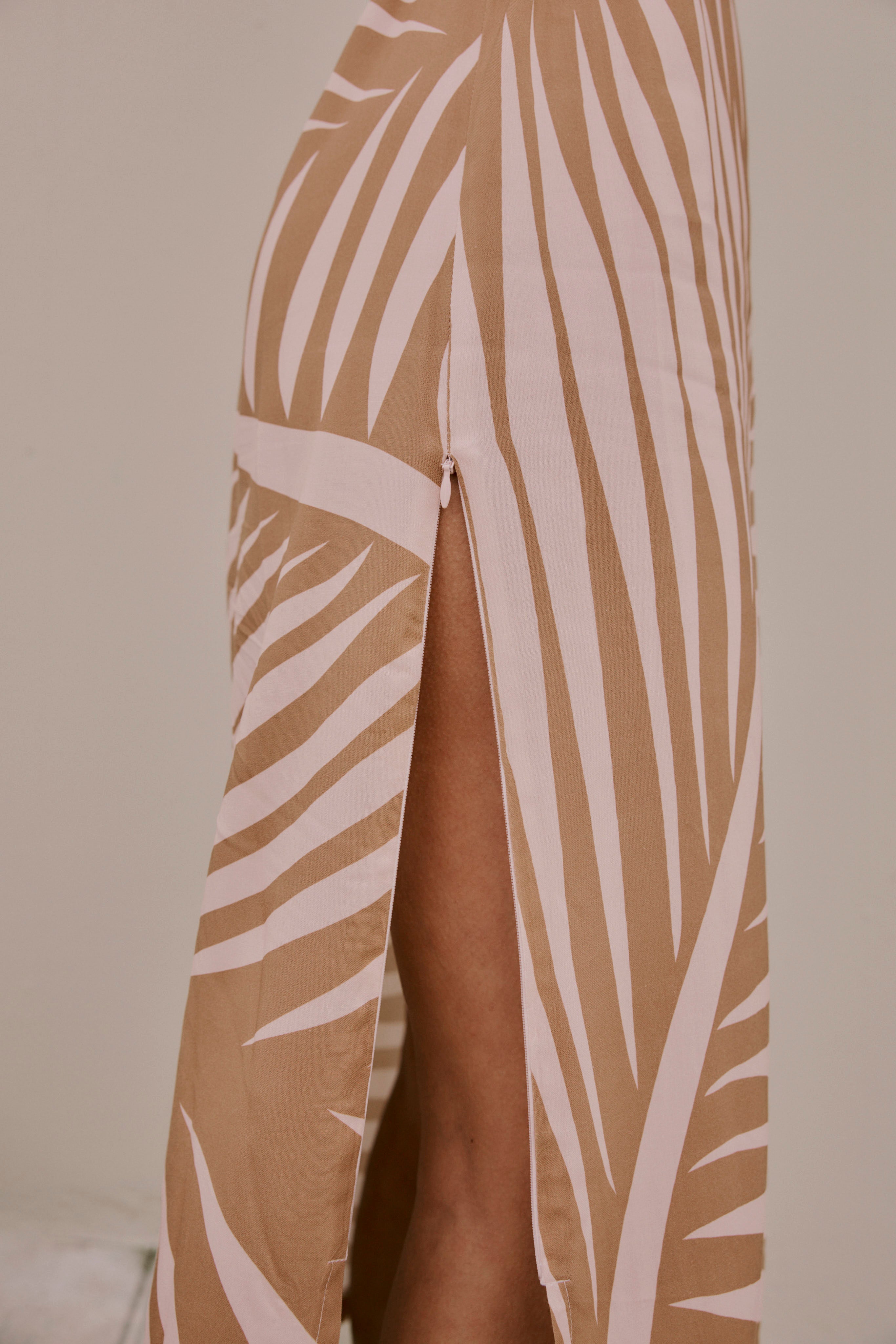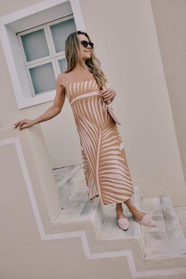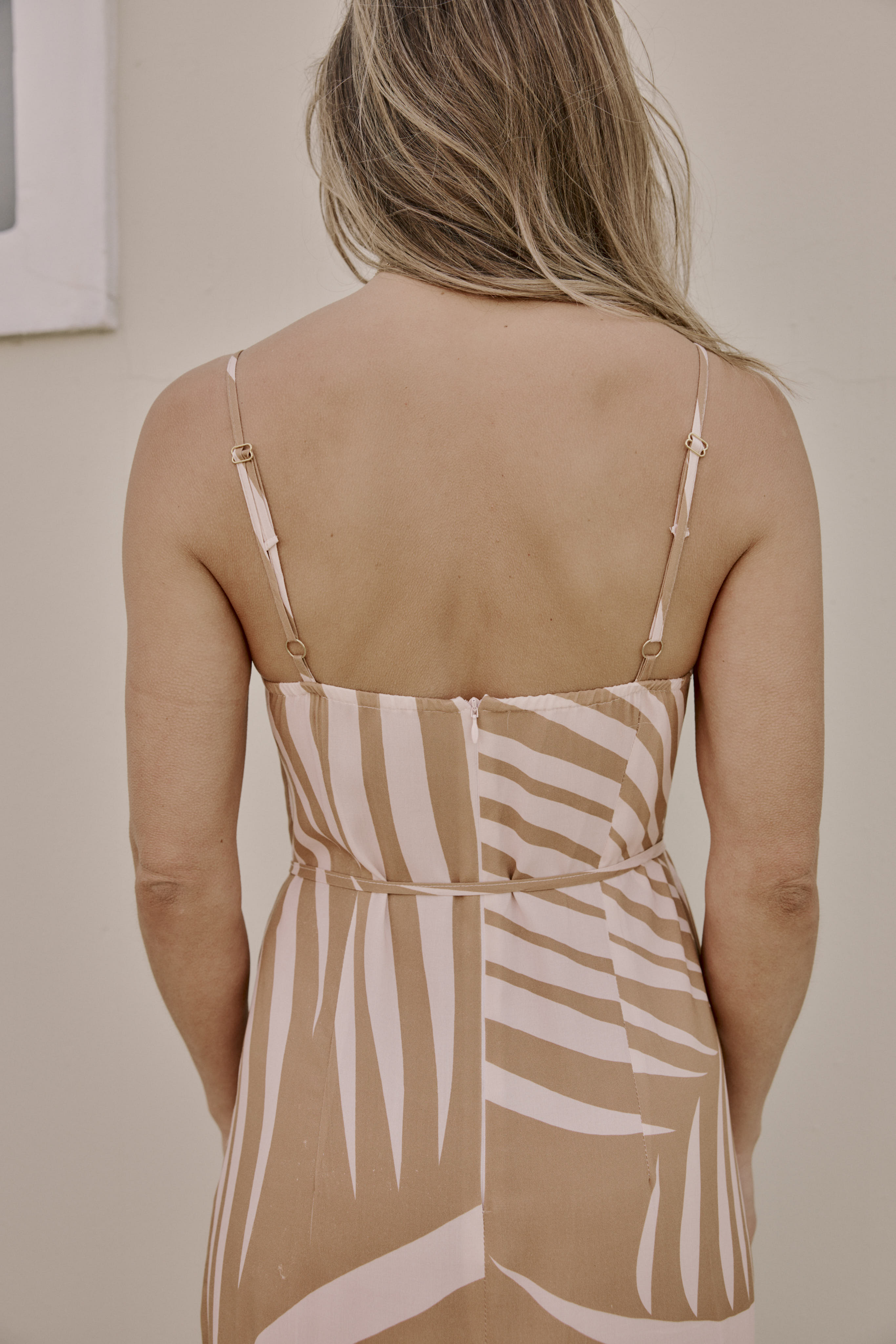 Midi length slip dress with a square neckline, centre back zipper, adjustable straps and side slits with adjustable zips.