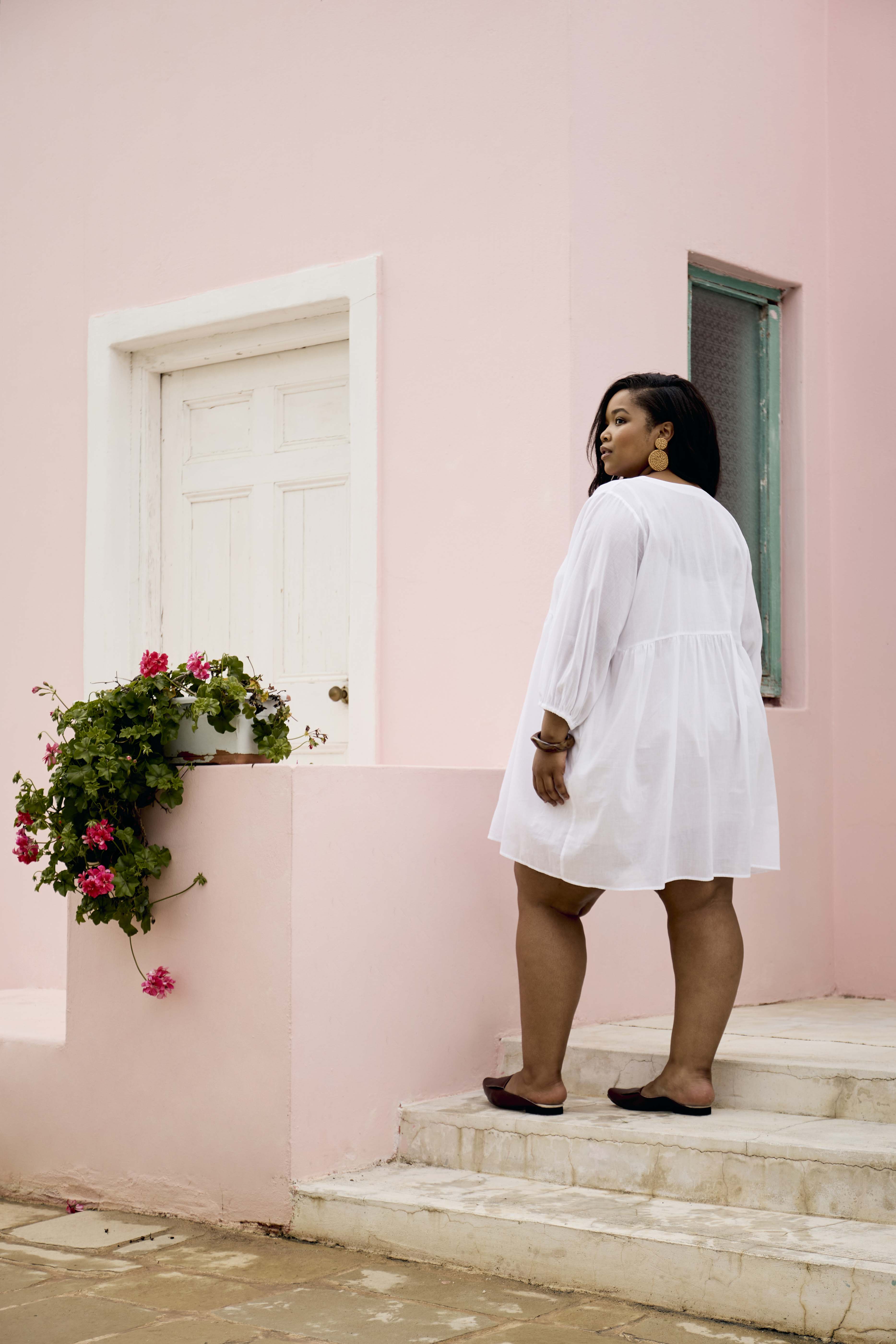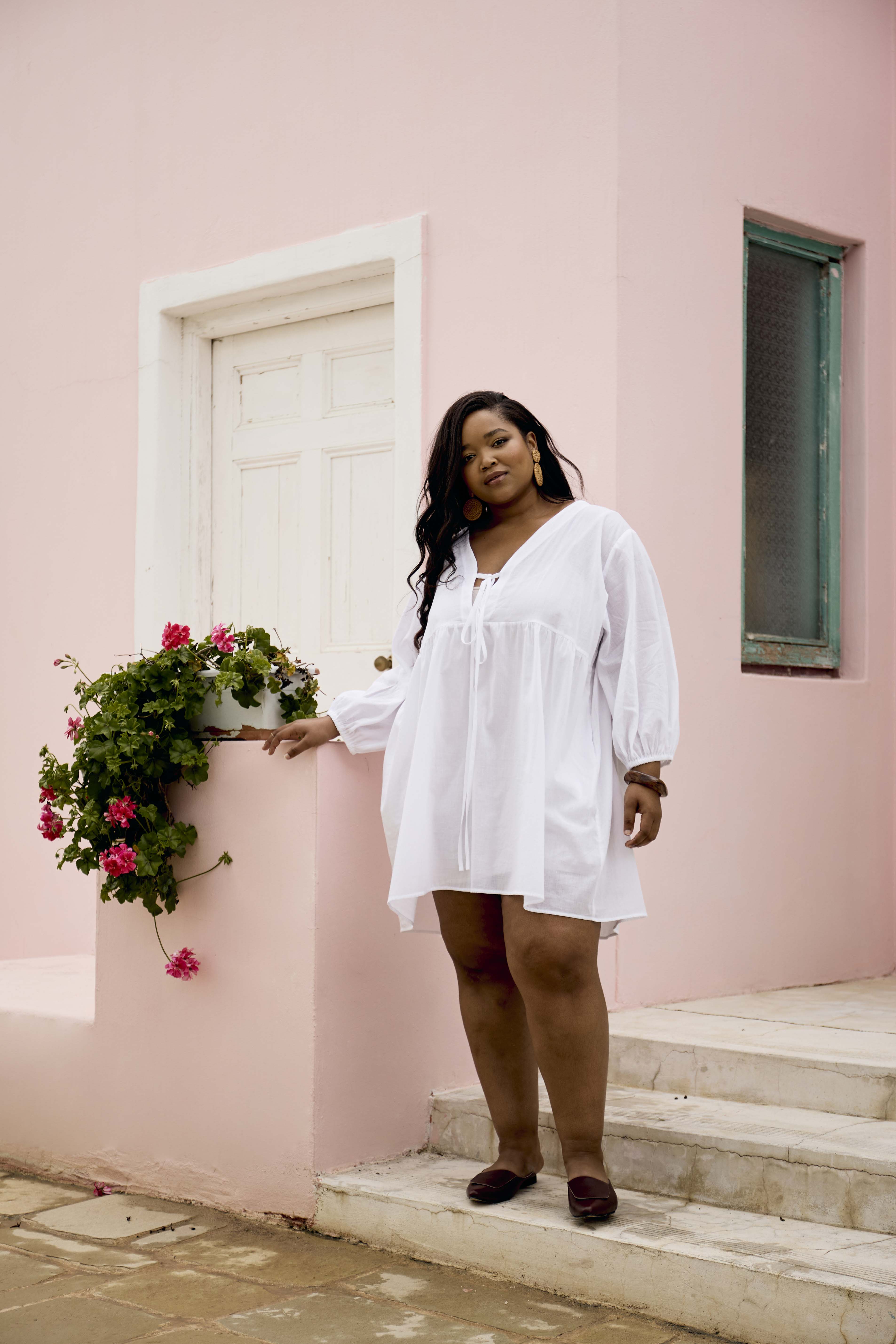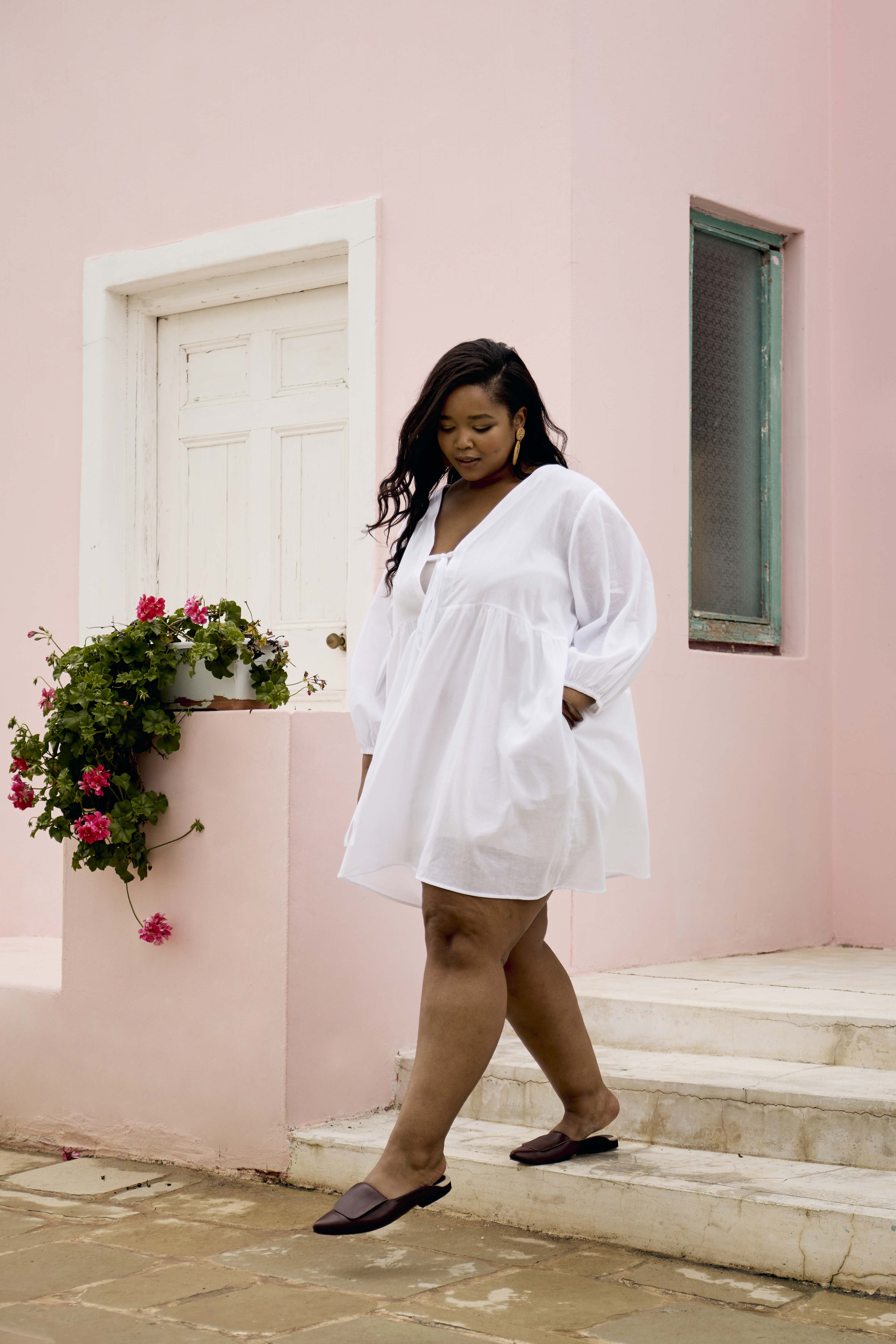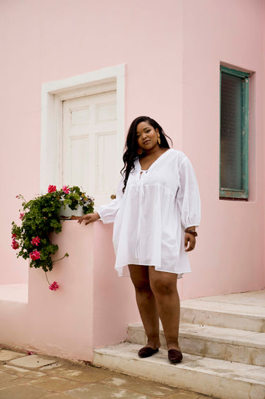 Mini dress with a gathered skirt, tie closure detail and elasticated blouson sleeves.