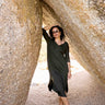 Reversible, sleek pull on midi-length dress with ¾ sleeves.