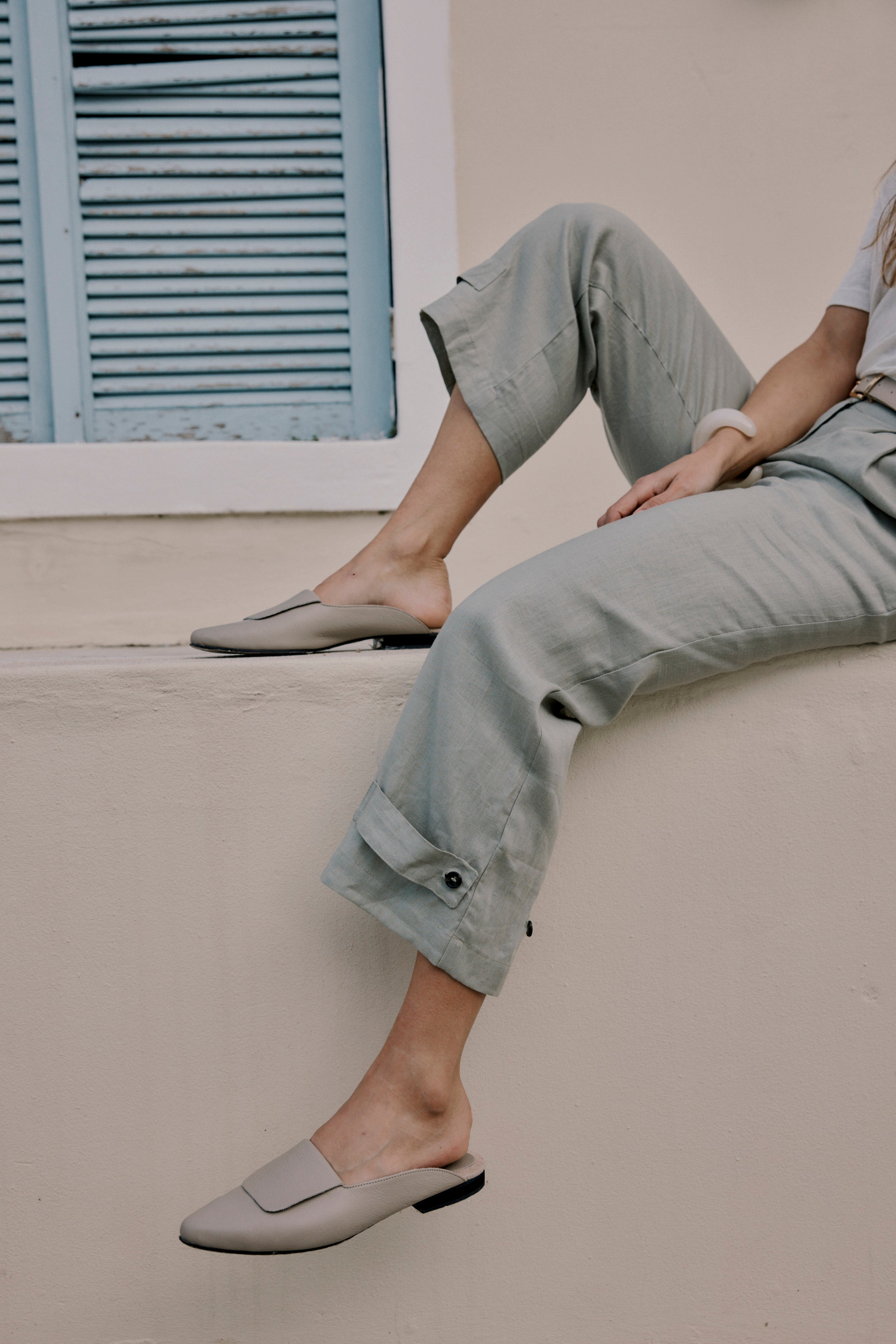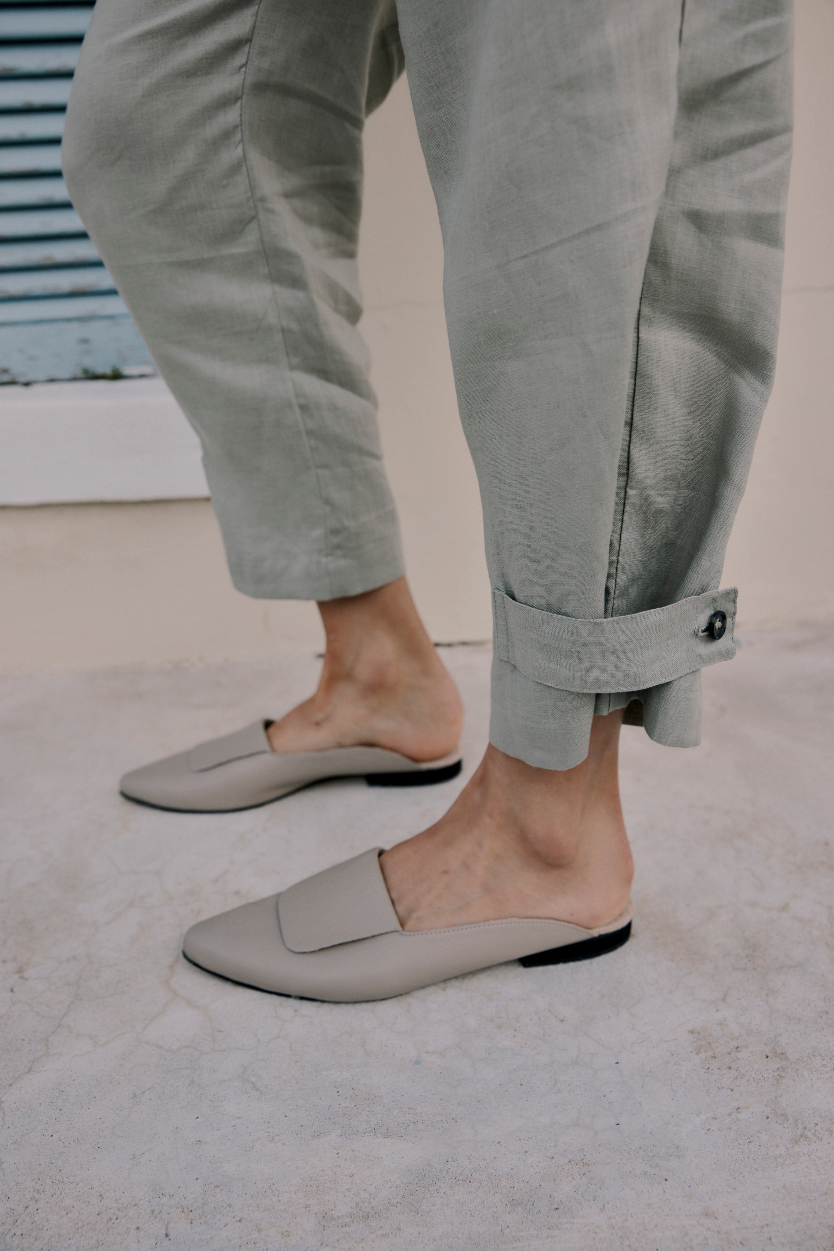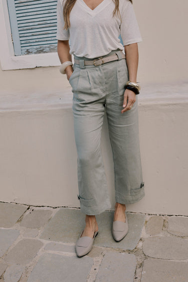 High waist, cropped linen pants with a paper-bag waistband, pleats and adjustable tabs on the hem.