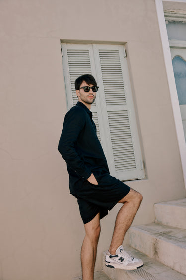 Linen shorts with an elasticated waistband with drawcord, inset pockets and a mock fly front.