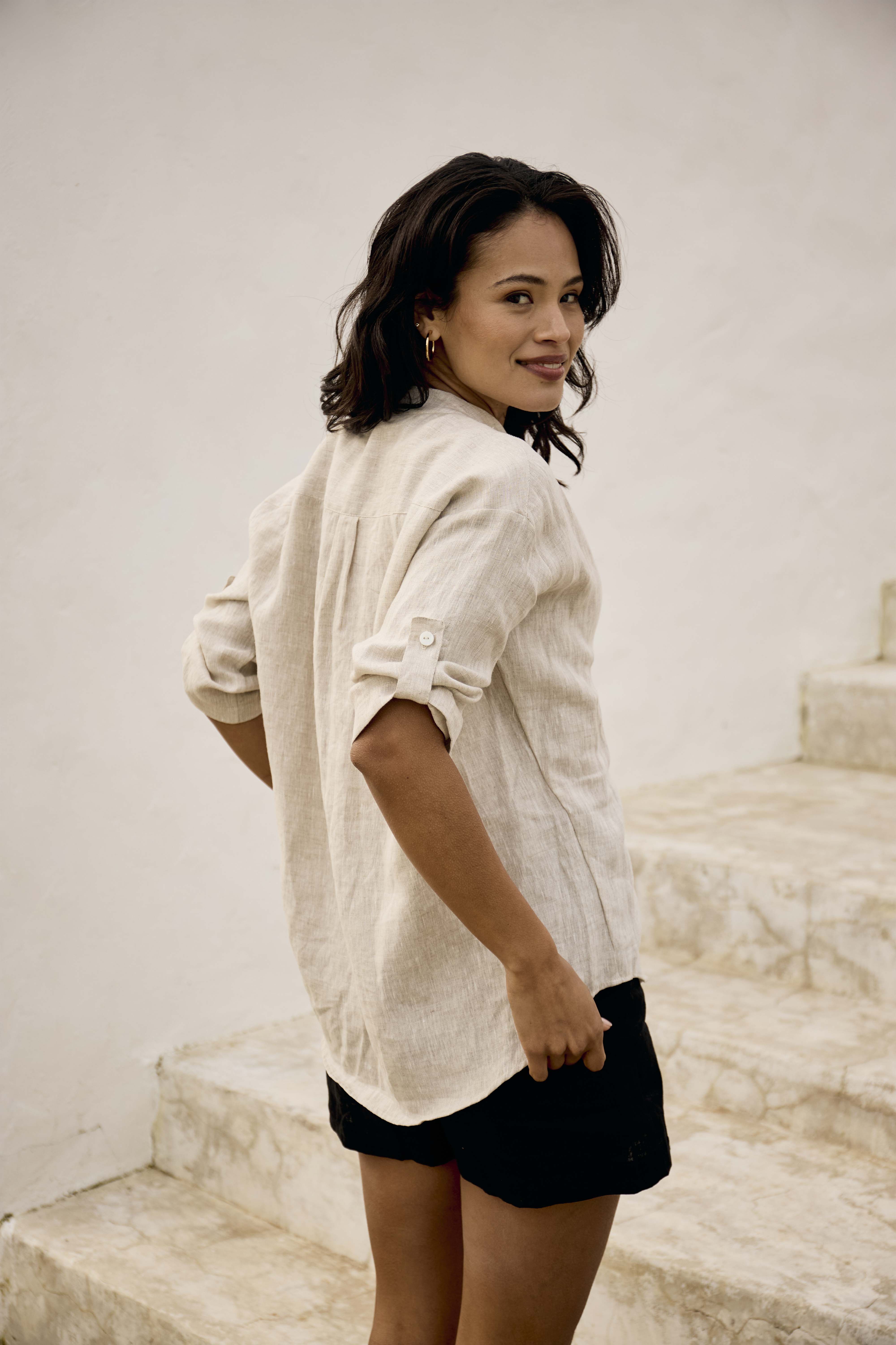 Loose fitting shirt with ¾ sleeves and optional tabs, a curved hem a mandarin collar.