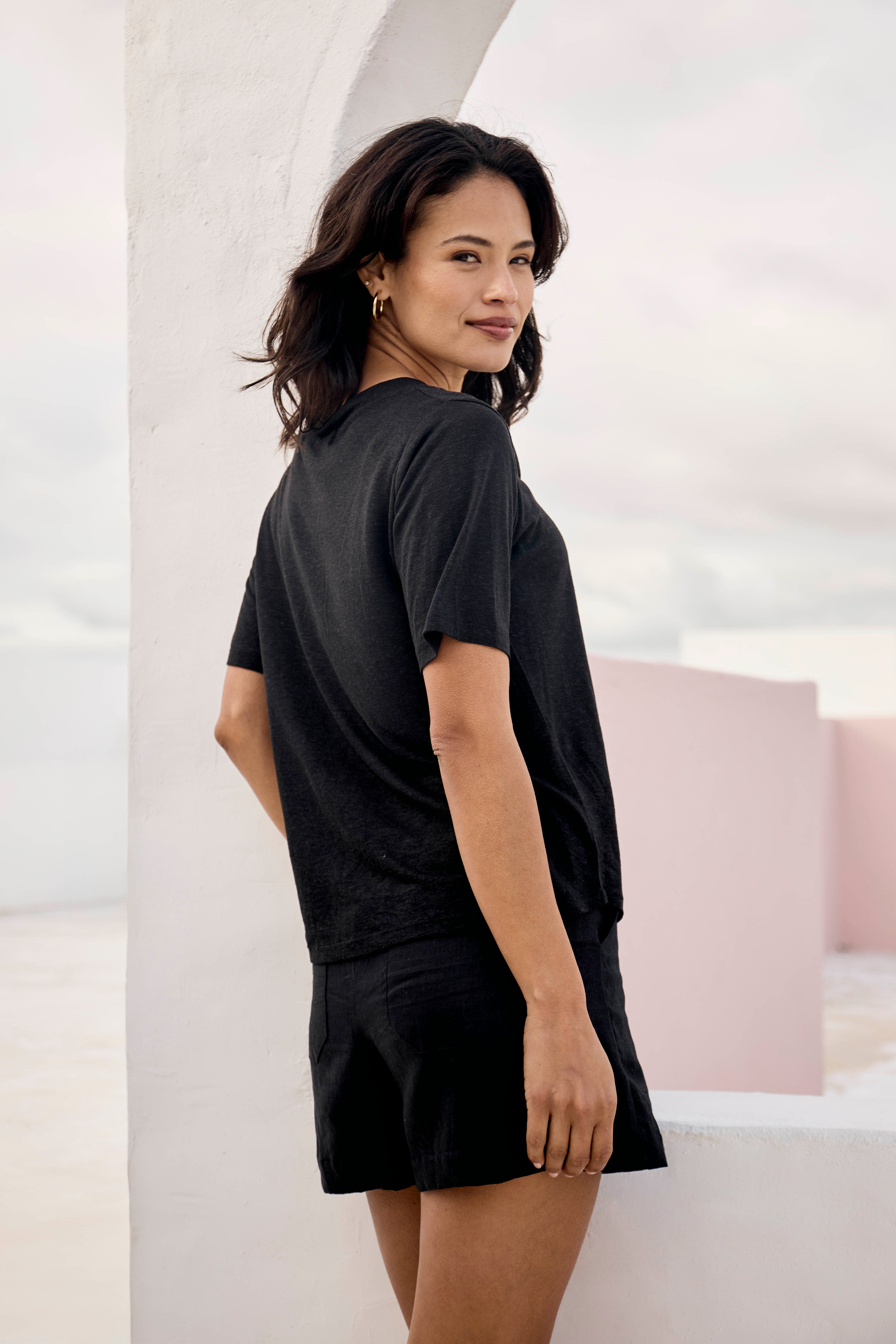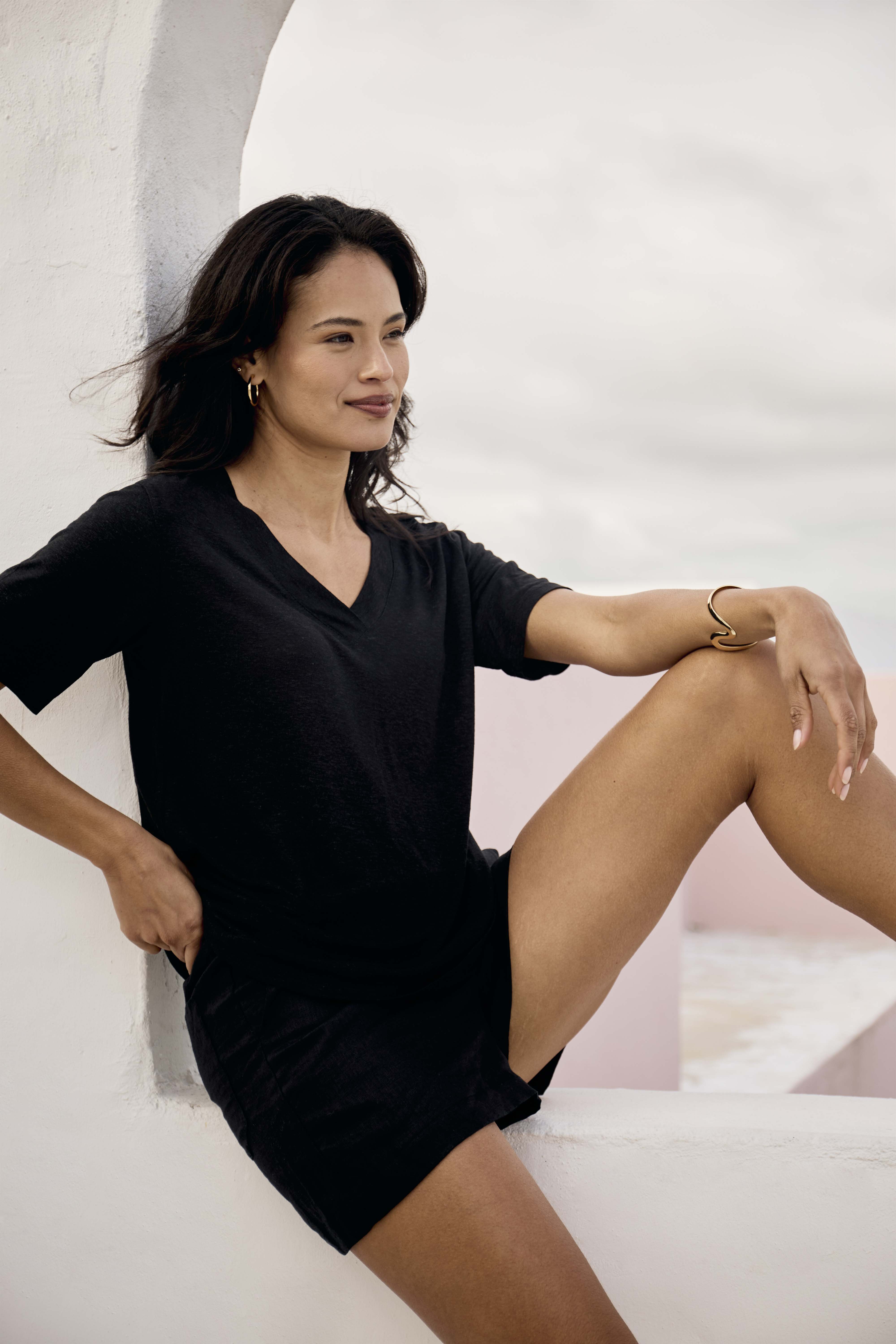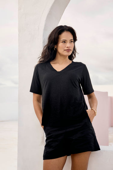 Slightly sheer regular fitting t-shirt with longer length sleeves and a thick bound v-neckline.