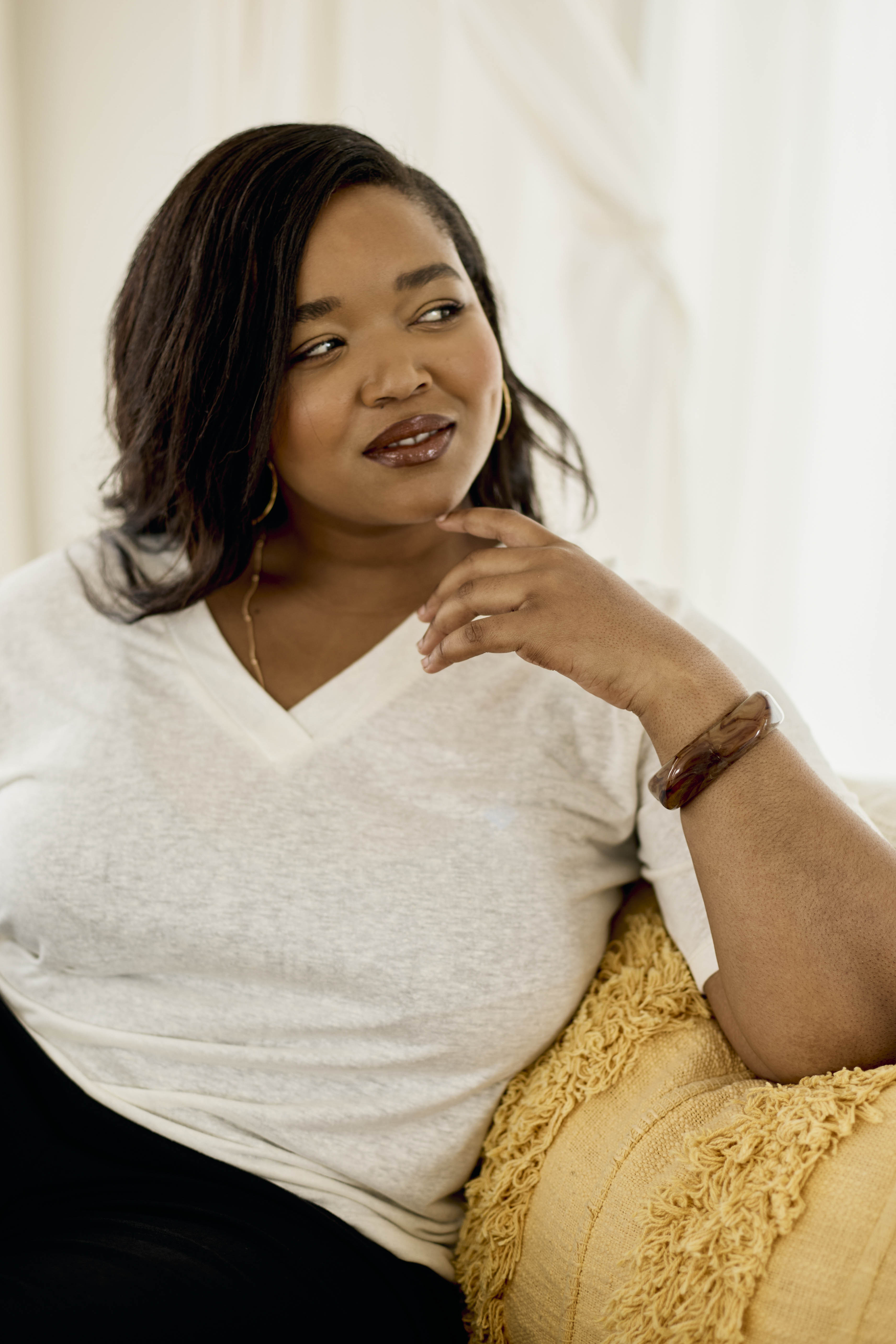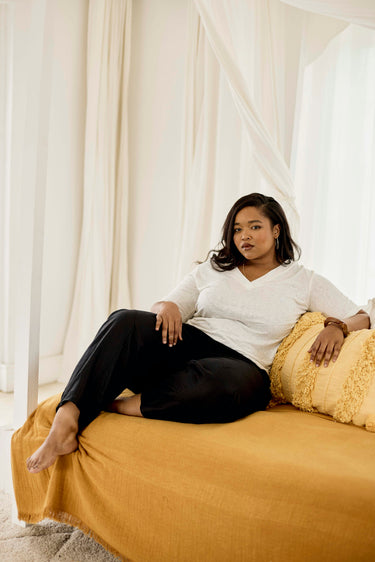 Slightly sheer regular fitting t-shirt with longer length sleeves and a thick bound v-neckline.
