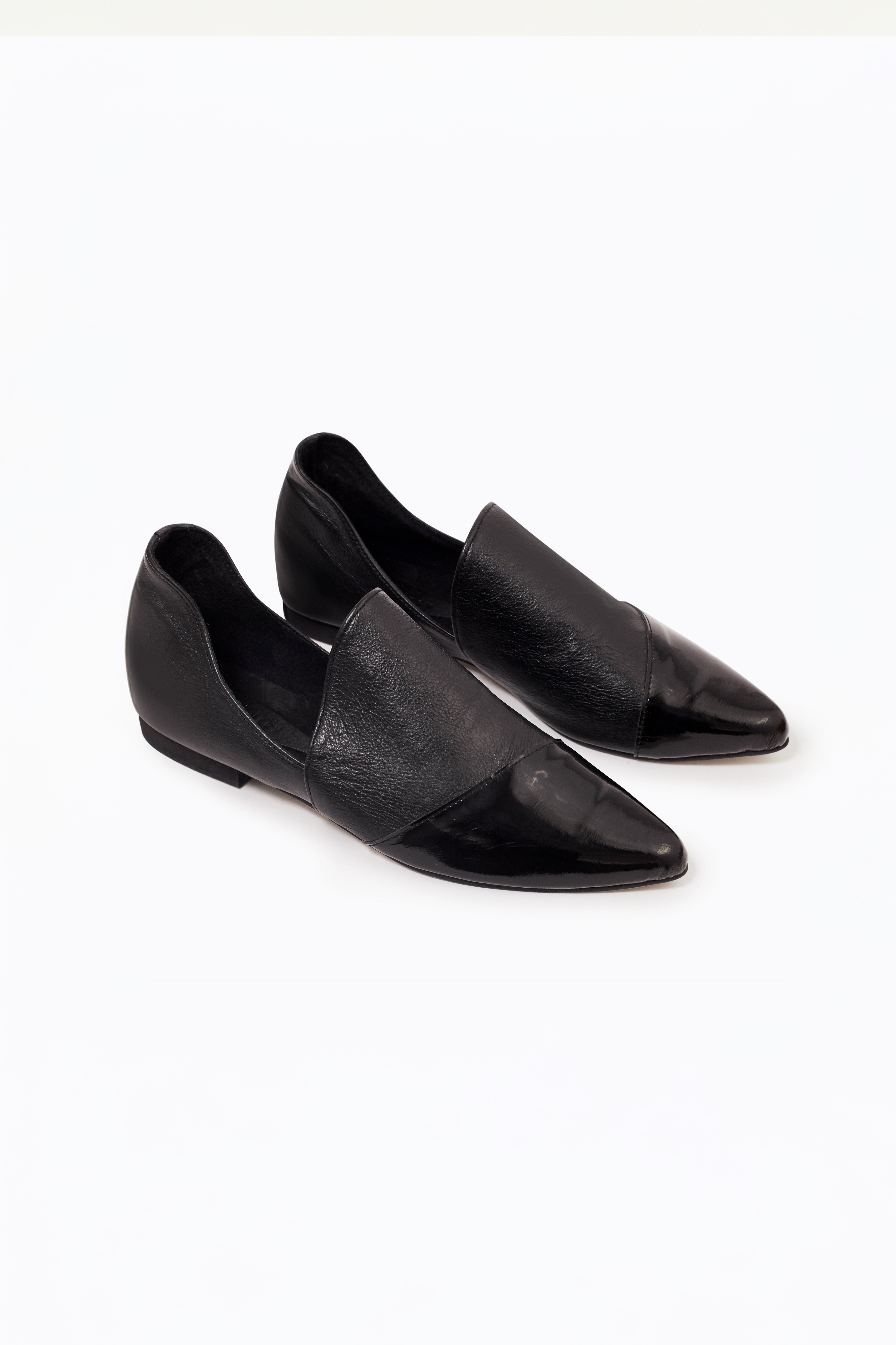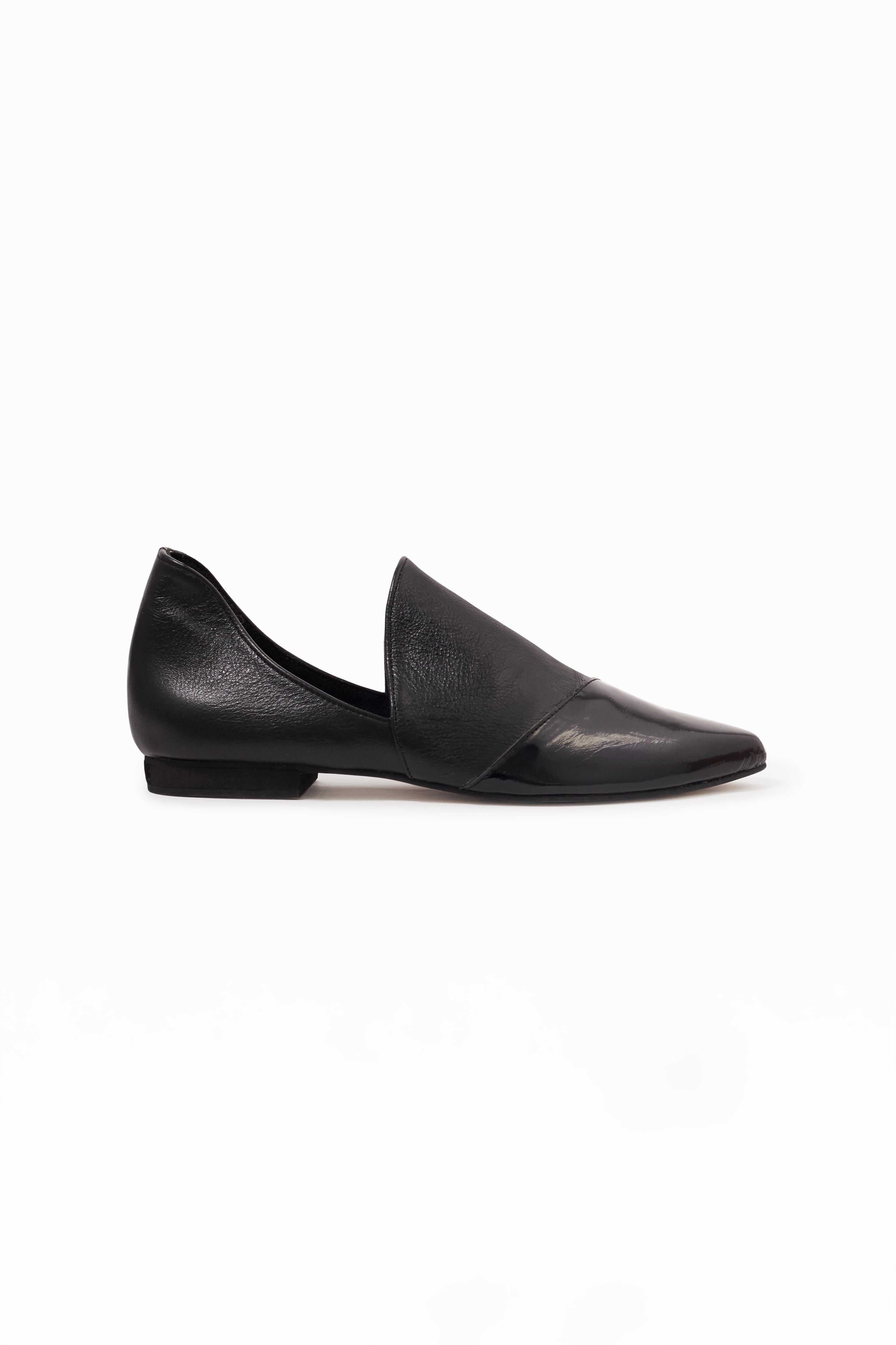 Slimline, sleek shoe with pointed toe and patent leather detailing.