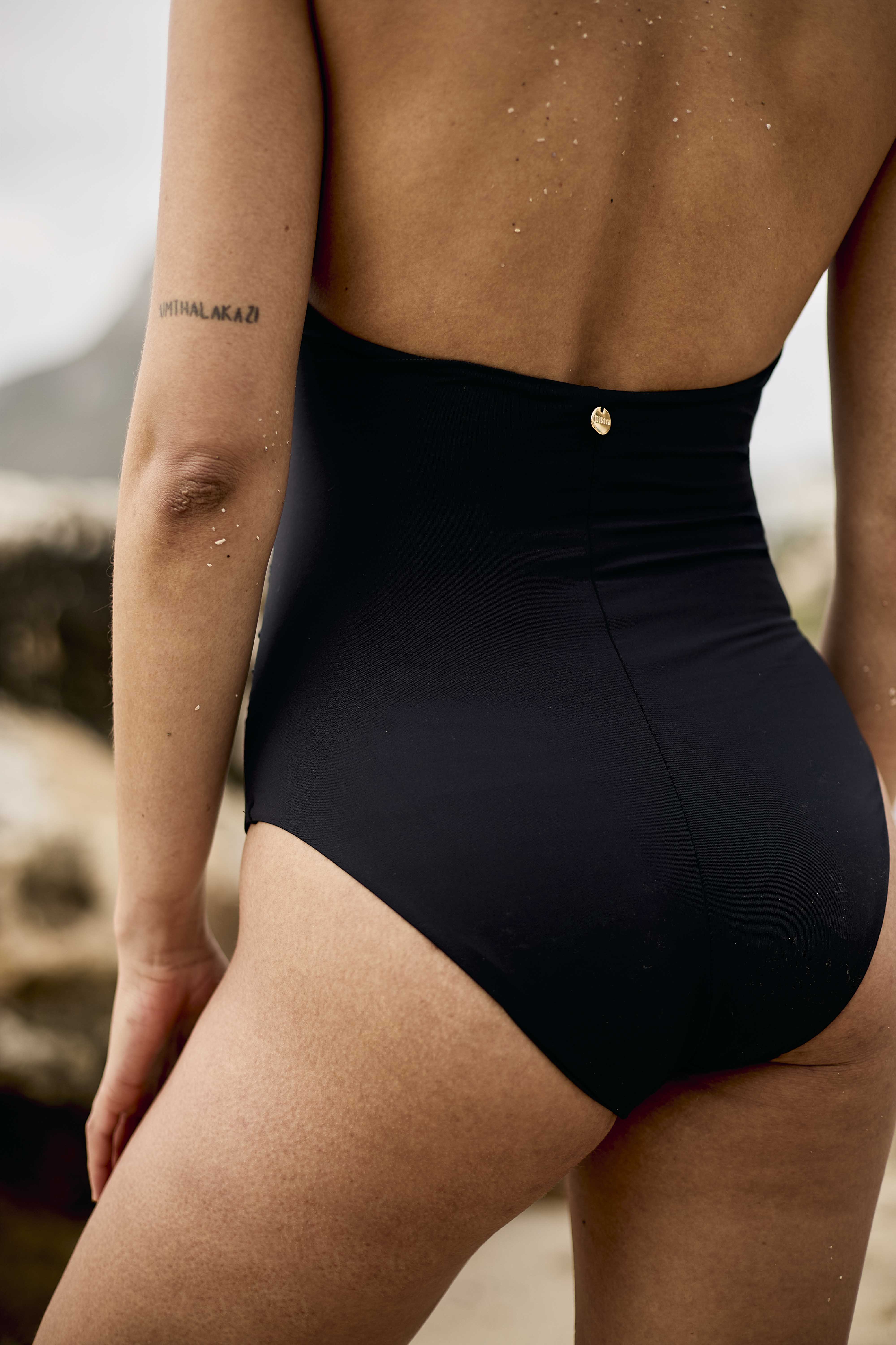 Full piece costume with twisted neckline. This swimsuit has moderate support and bum coverage with a tie halter neck closure.