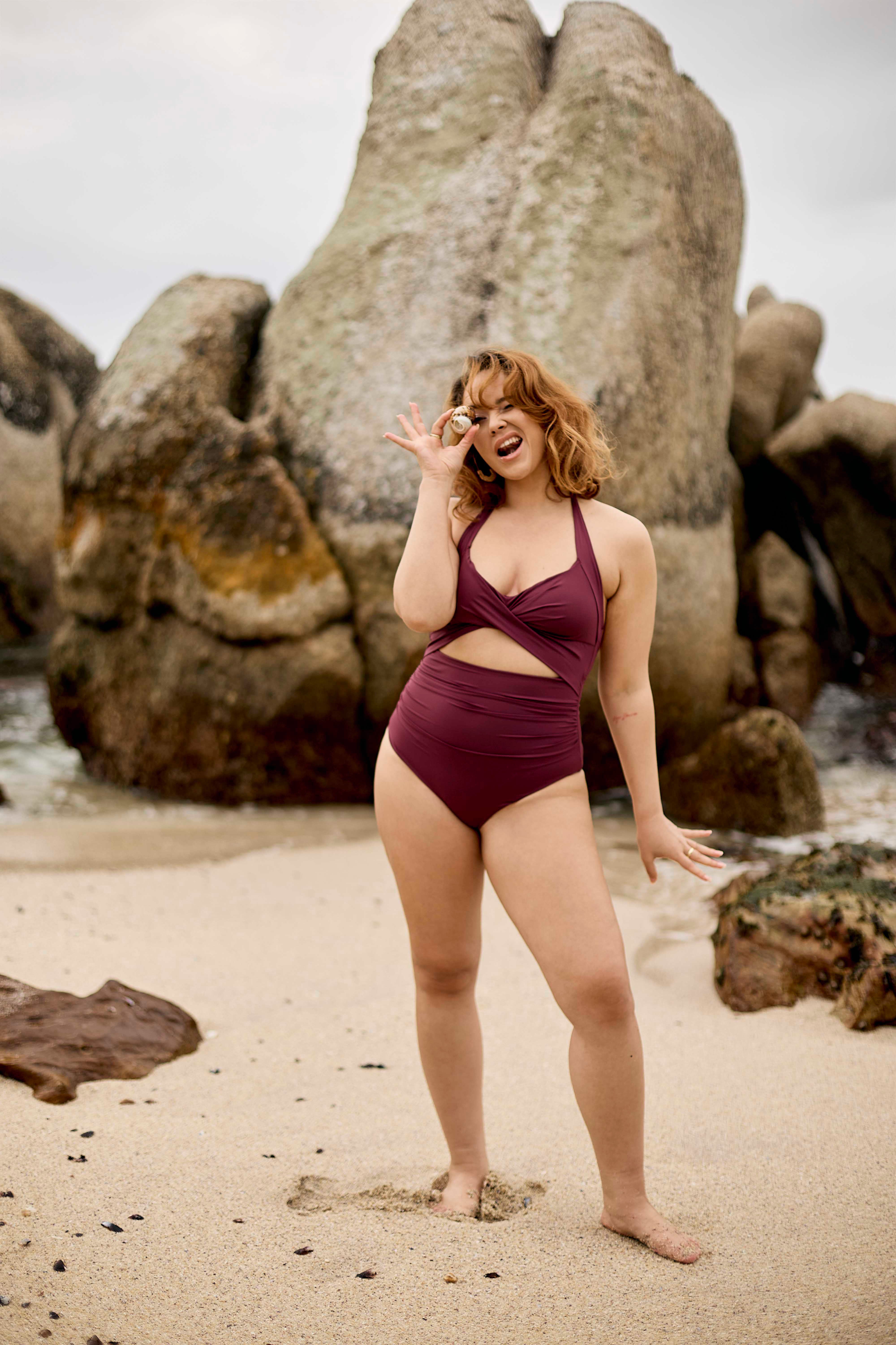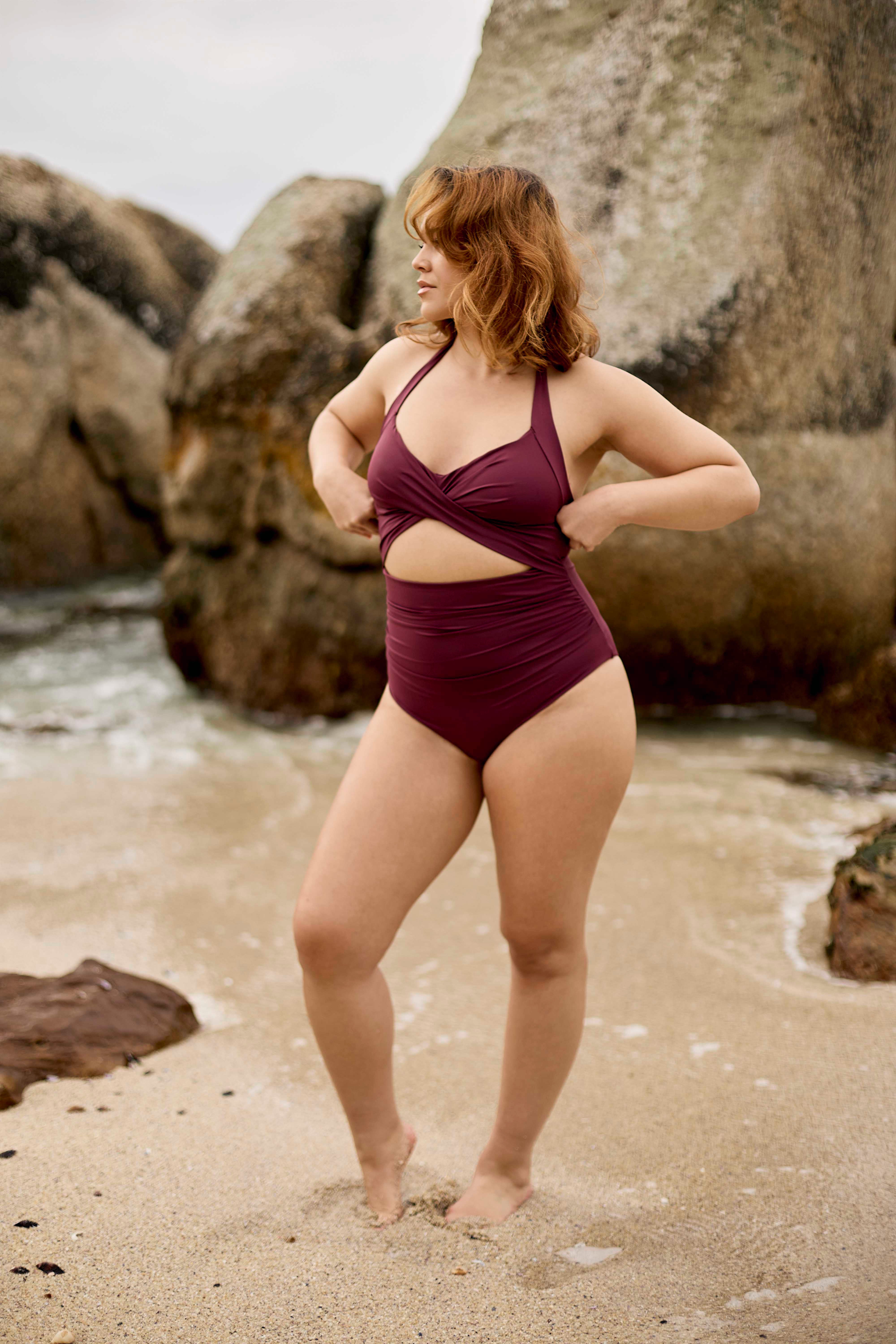 Full piece costume with twisted neckline. This swimsuit has moderate support and bum coverage with a tie halter neck closure.