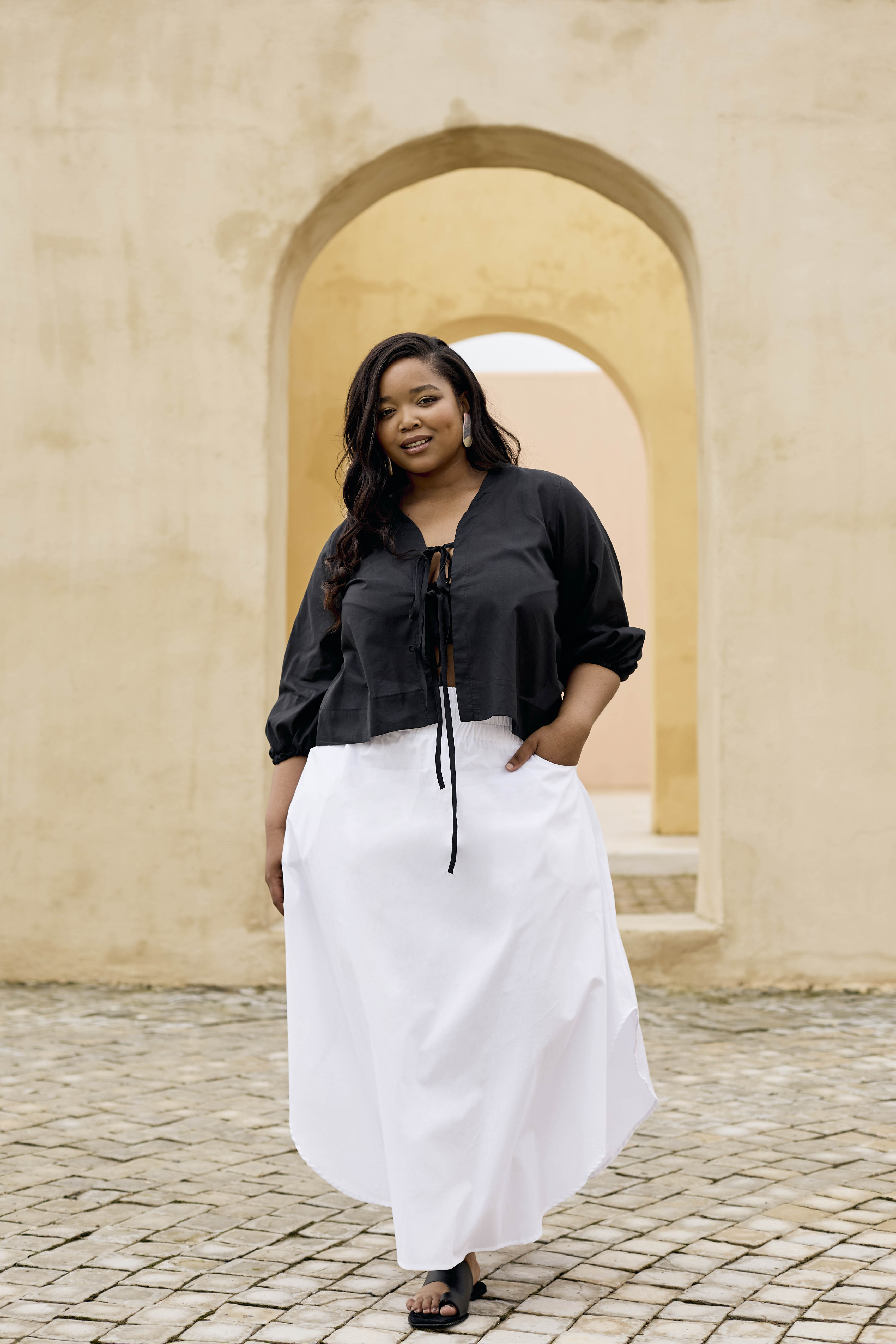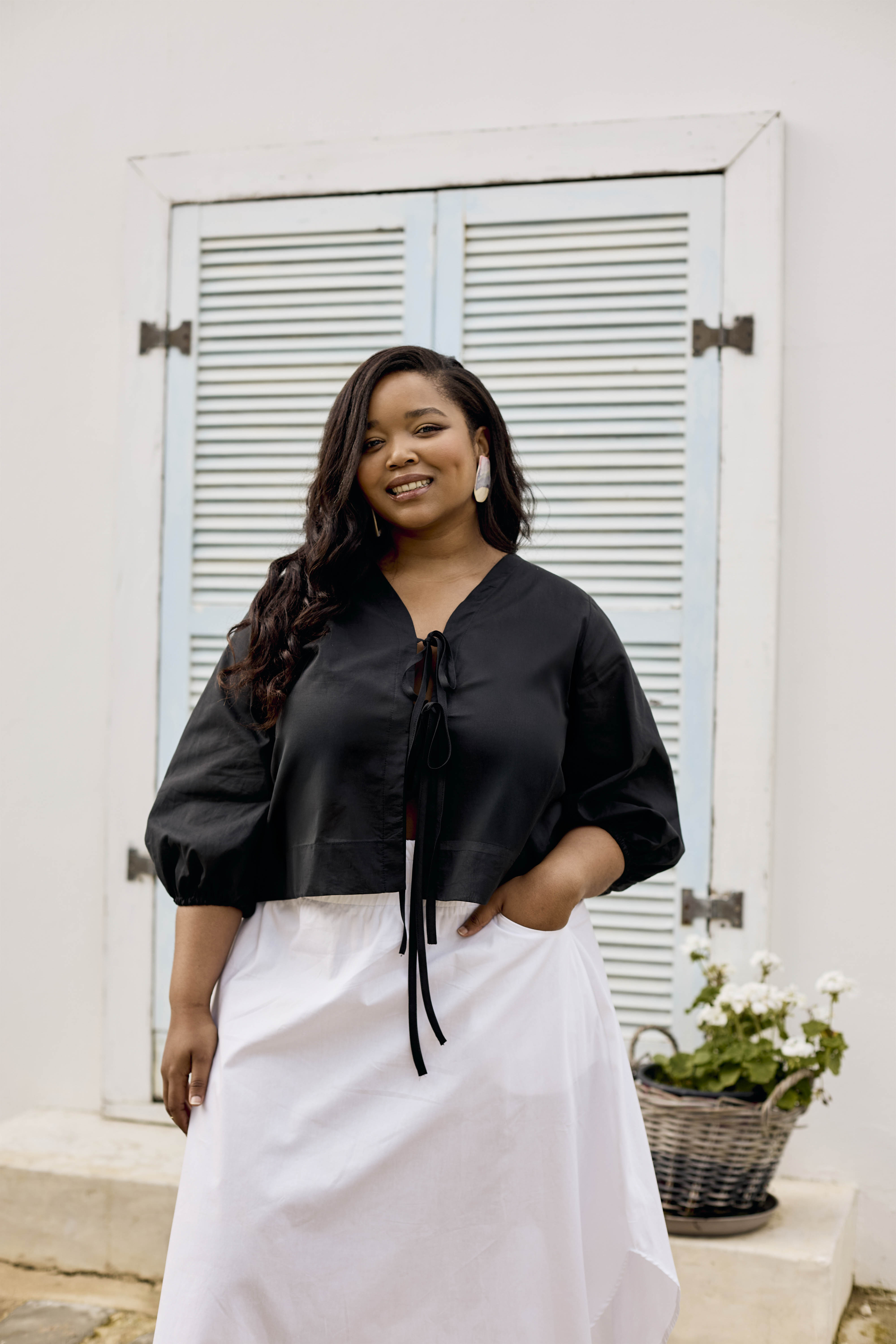 Slightly sheer, loose fitting top with two front tie closures and blouson elasticated sleeves.