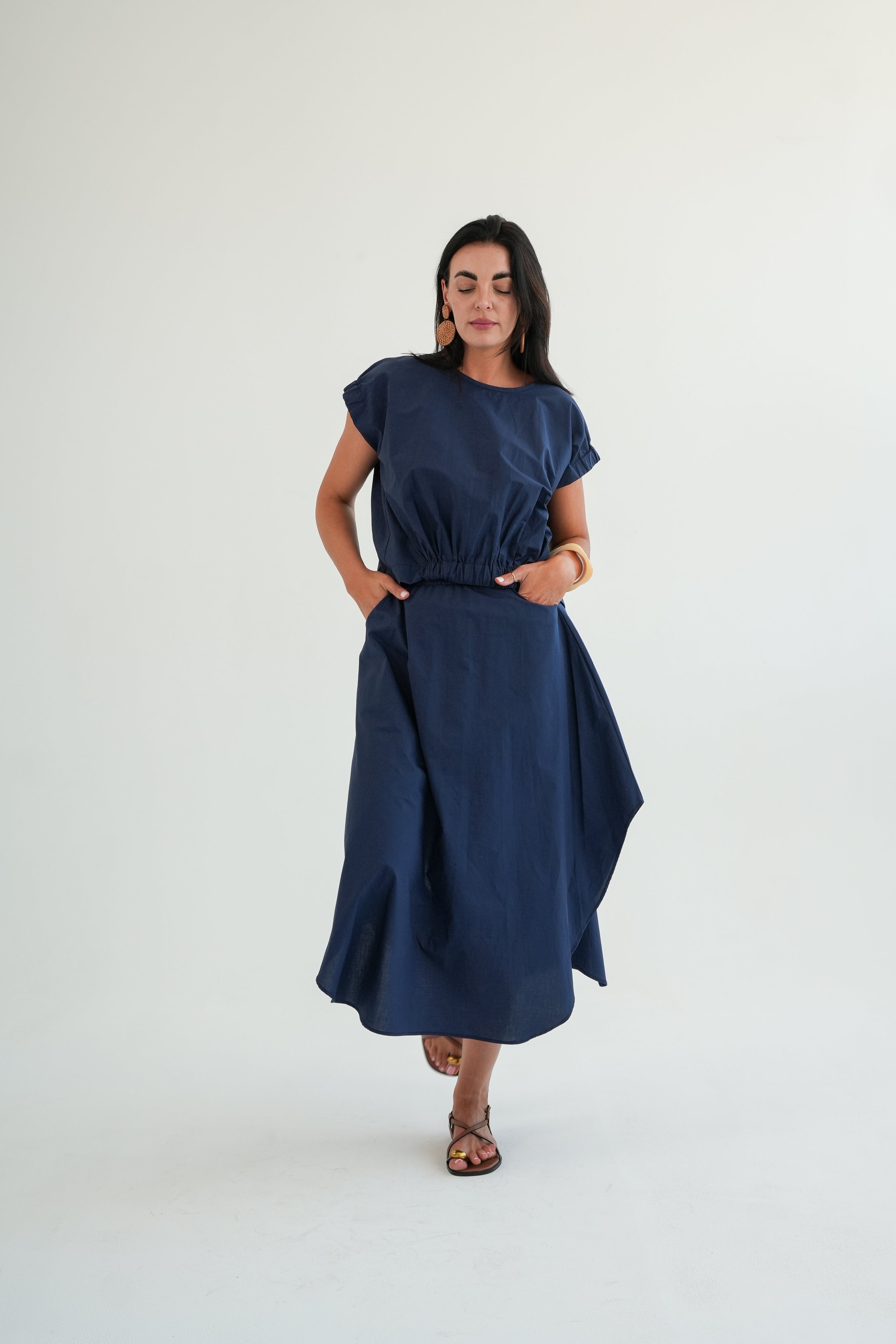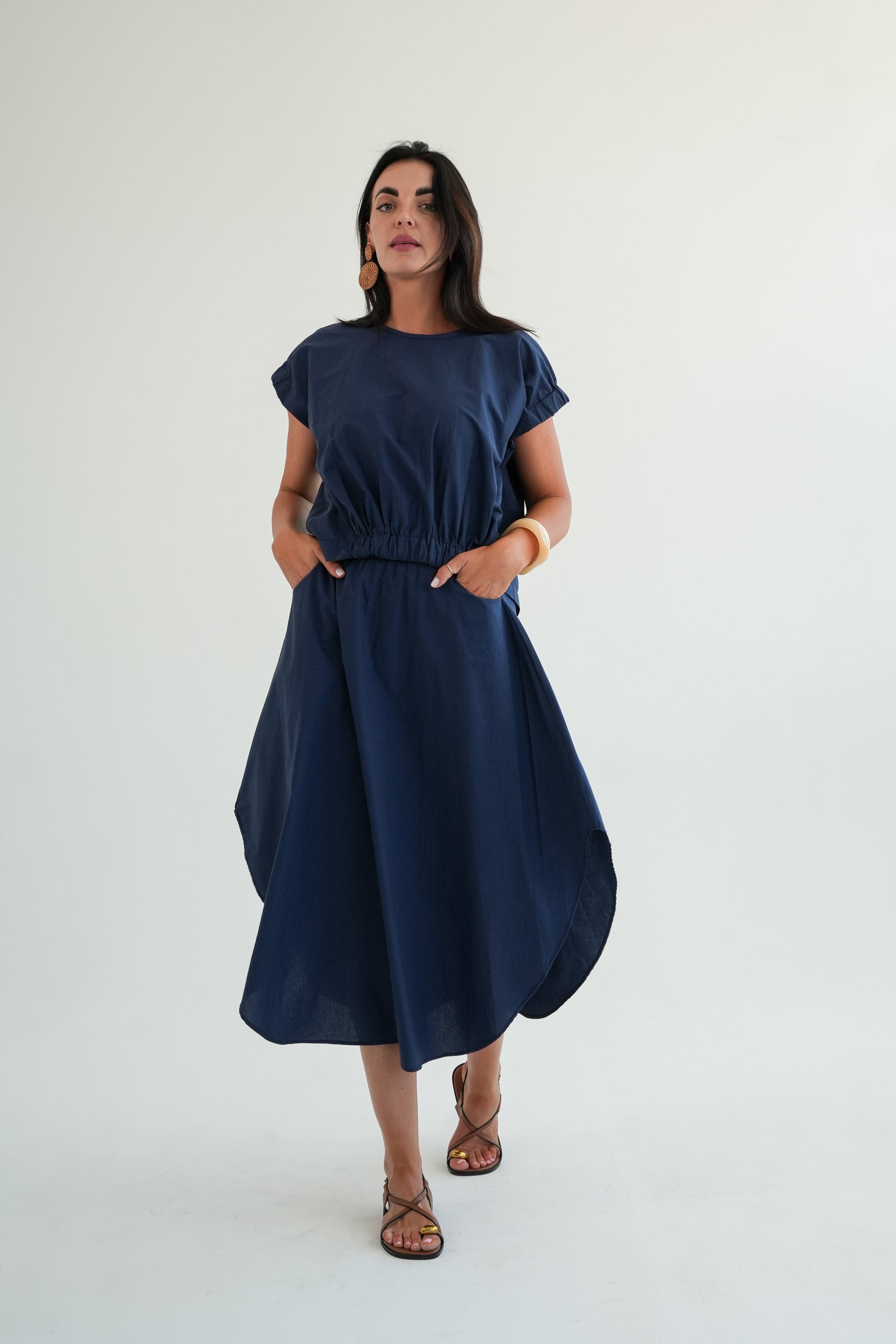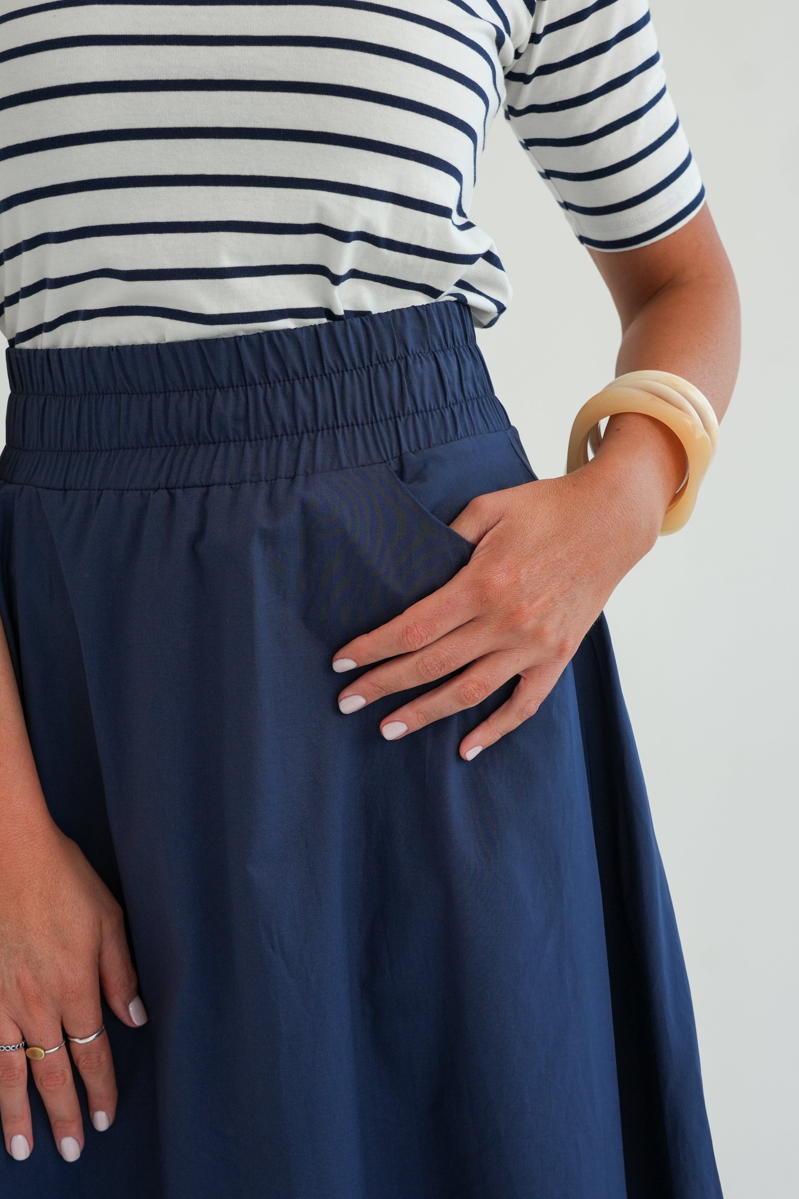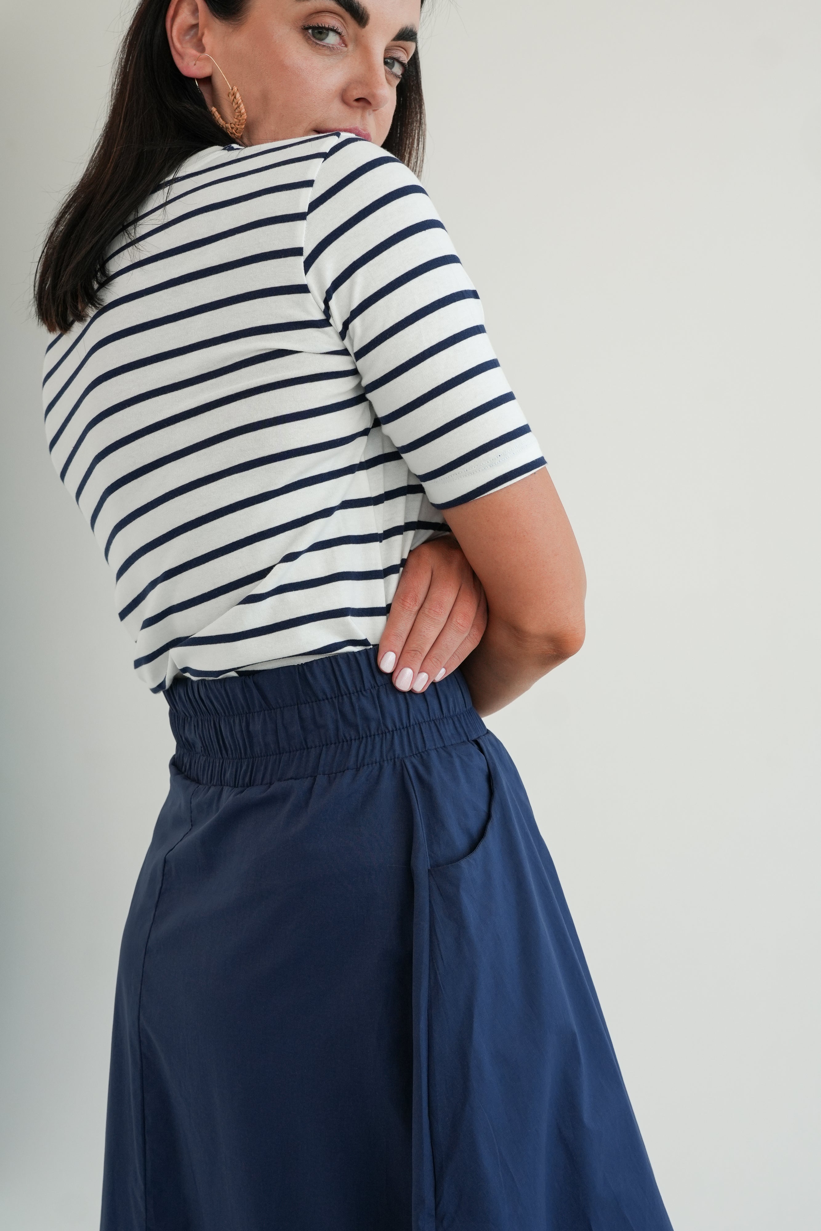 Ankle length skirt with a thick elasticated waistband, exaggerated curved hem and pockets.