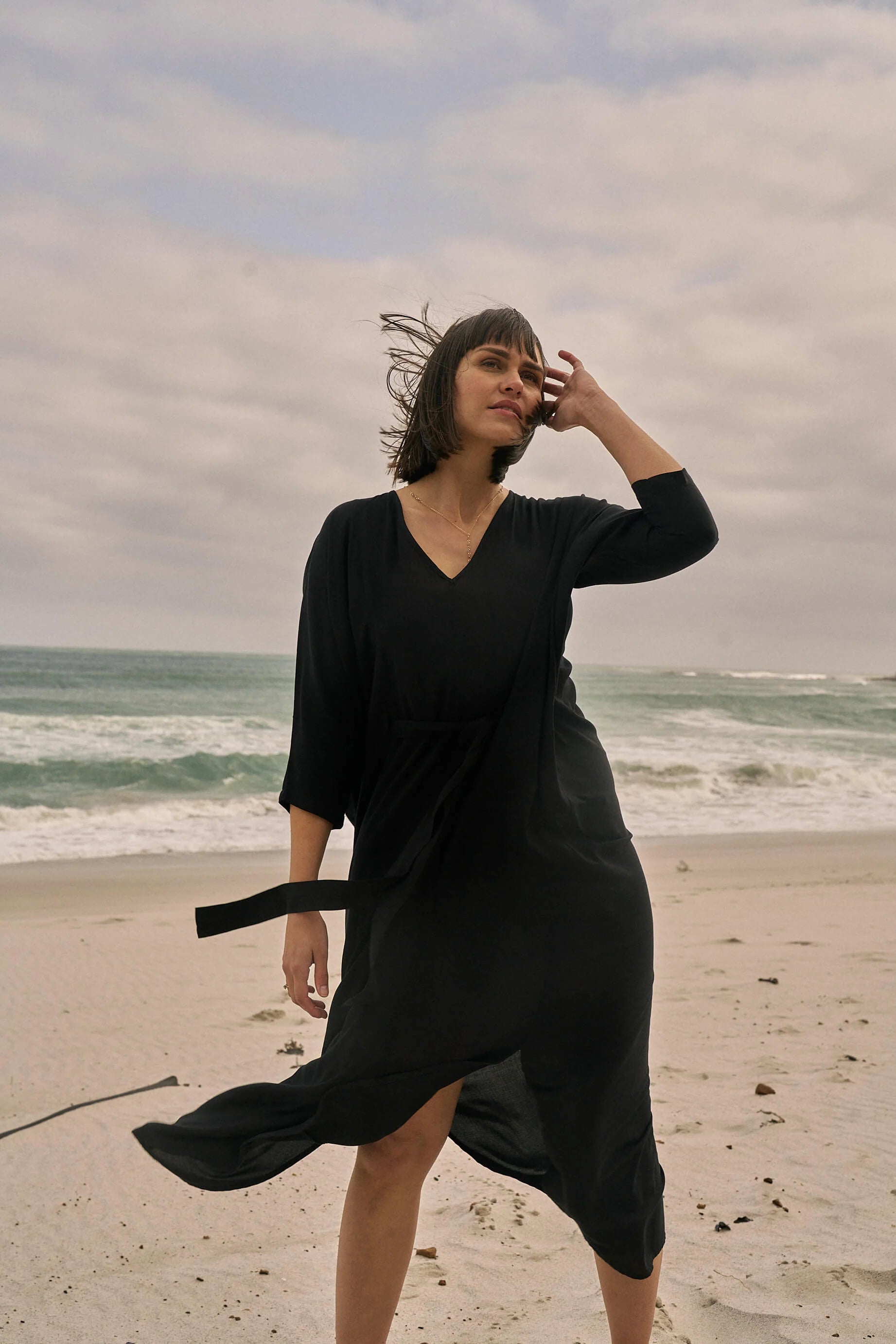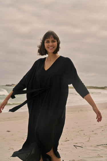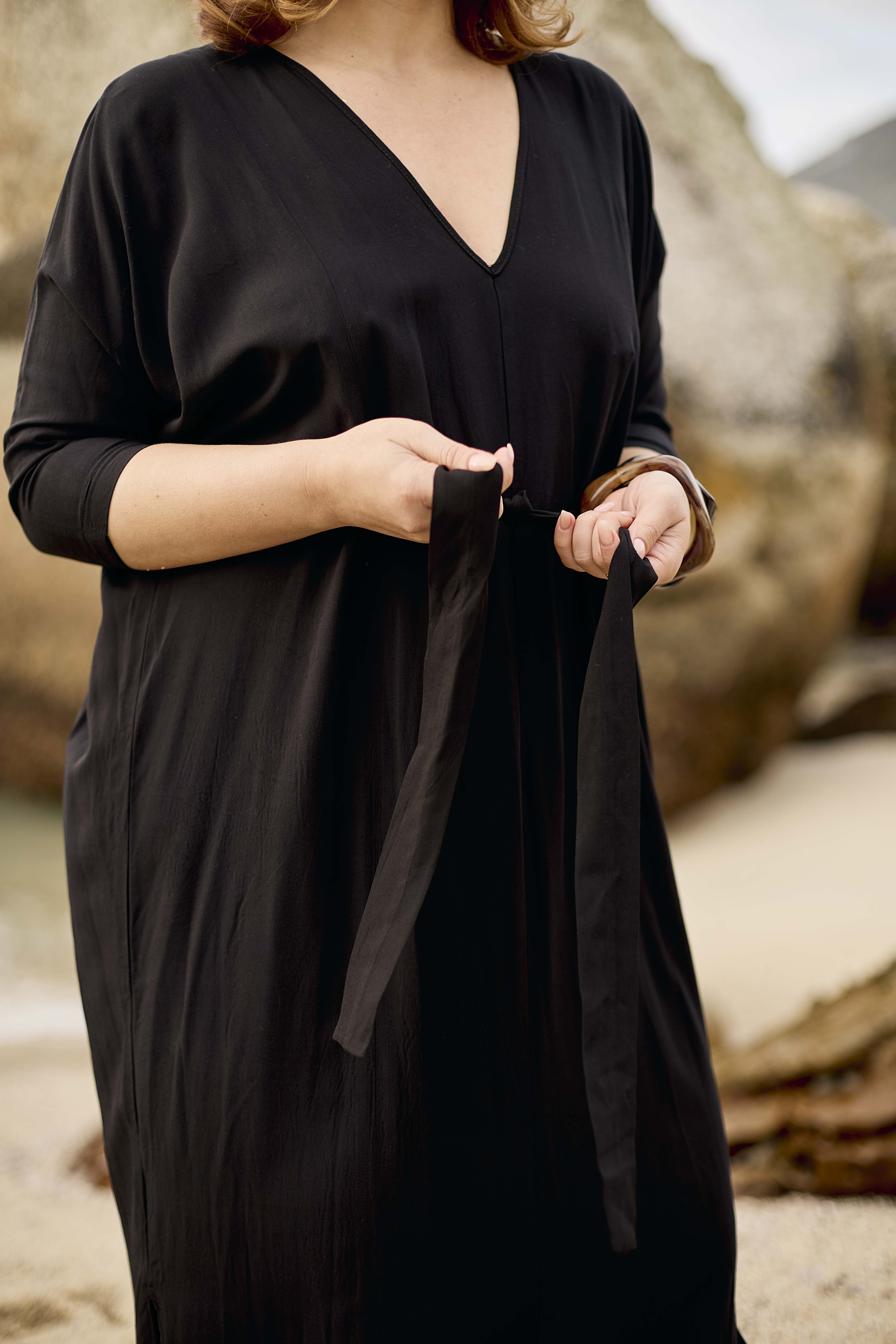 Loose fitting, v-neck kaftan with ¾ sleeves and a curved hem. Slits at the waist for the separate belt to be tied in multiple ways.
