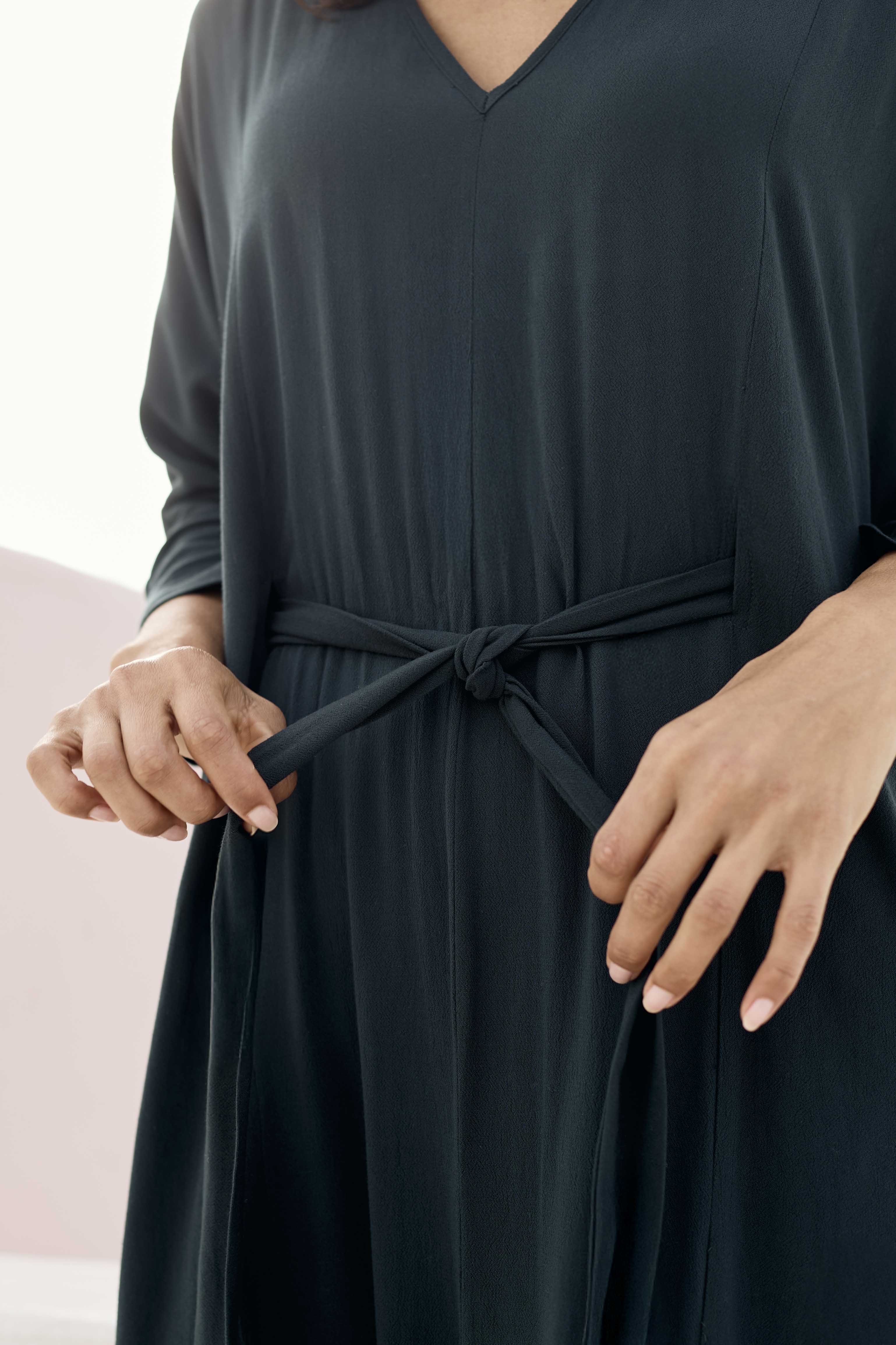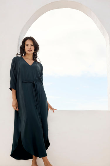 Loose fitting, v-neck kaftan with ¾ sleeves and a curved hem. Slits at the waist for the separate belt to be tied in multiple ways.