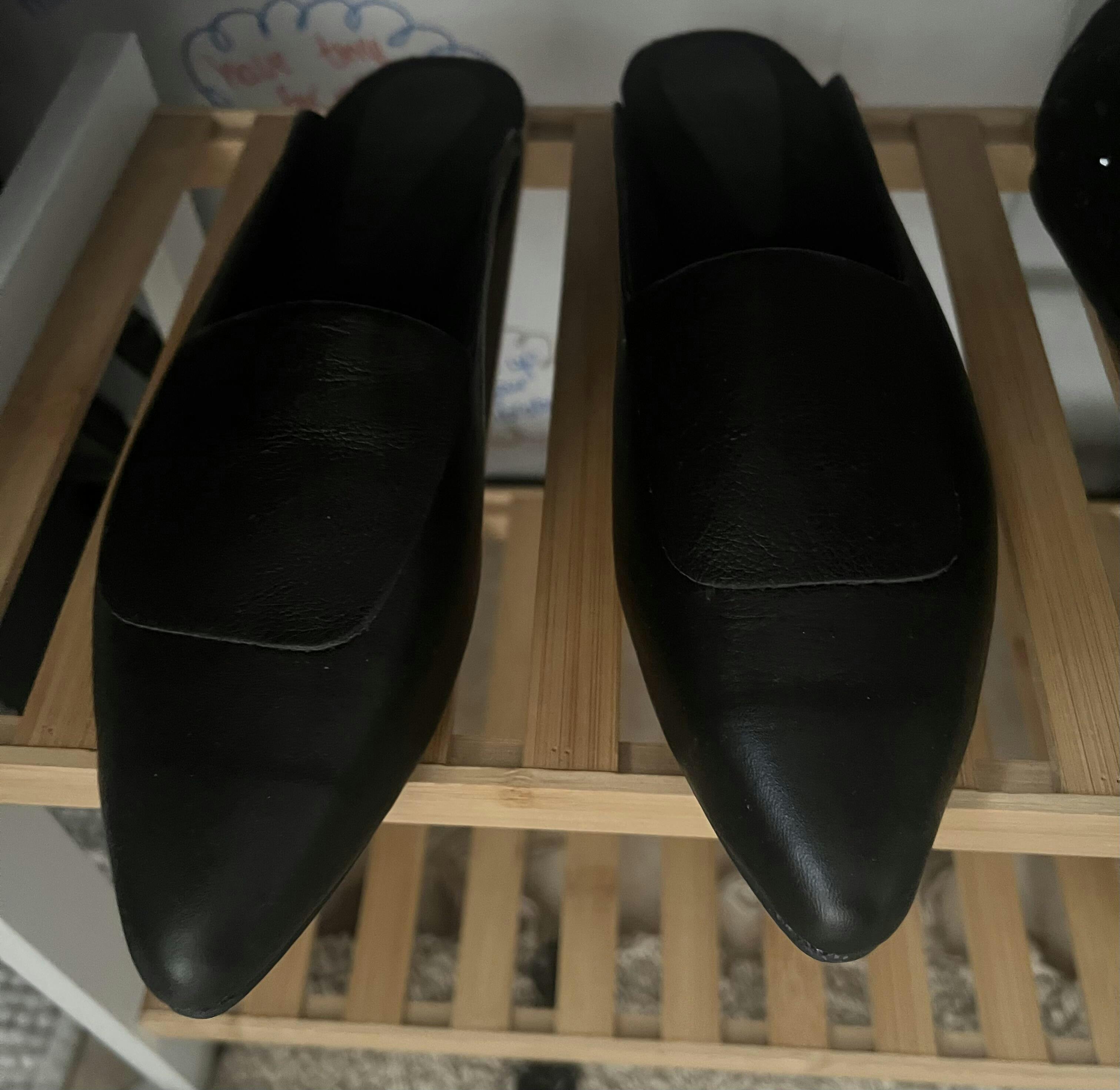 Why we love it : The Fold-over Mule was the first shoe style that we released and remains our most popular shoe. This sleek shoe can be worn casually or as a replacement for heels when attending an event. The narrow shape of the shoe means that some customers may need to take a size bigger than usual. All leather shoes stretch with wear.