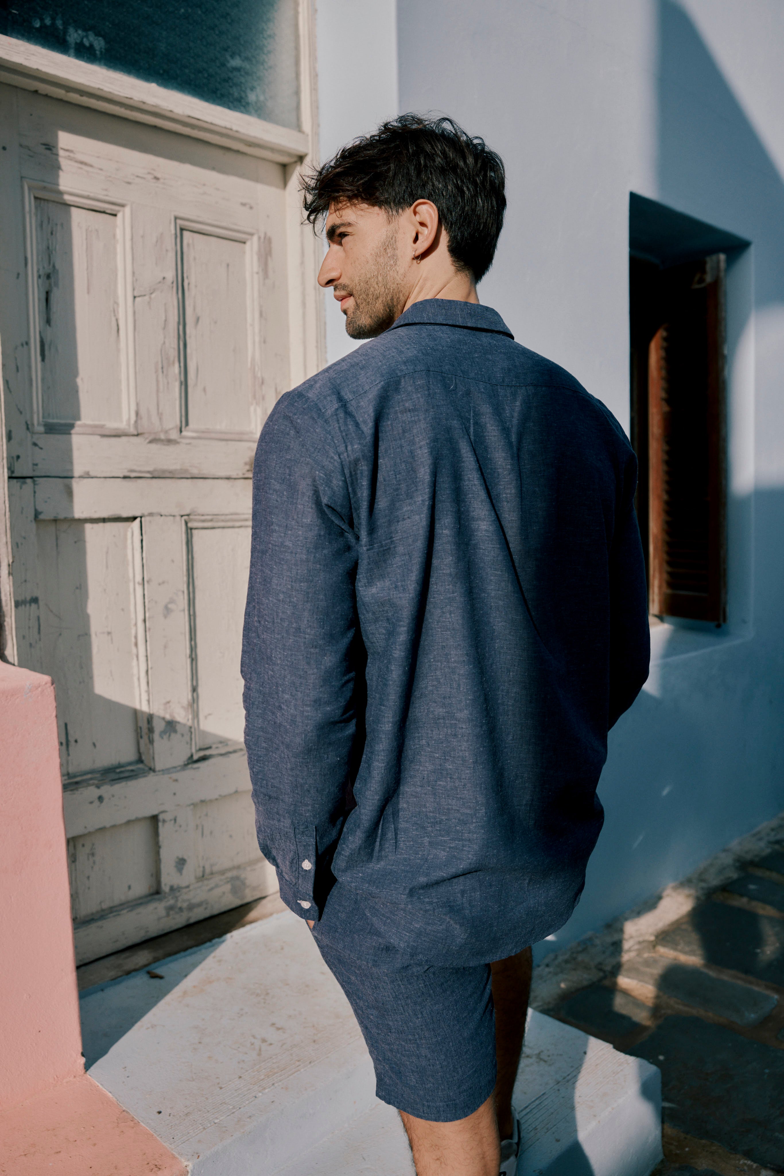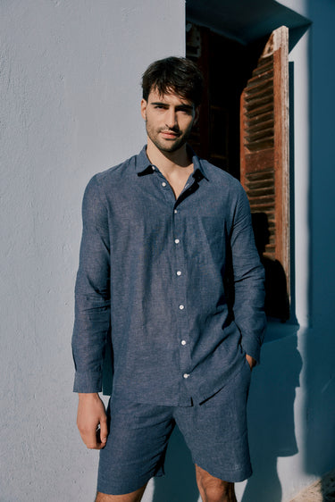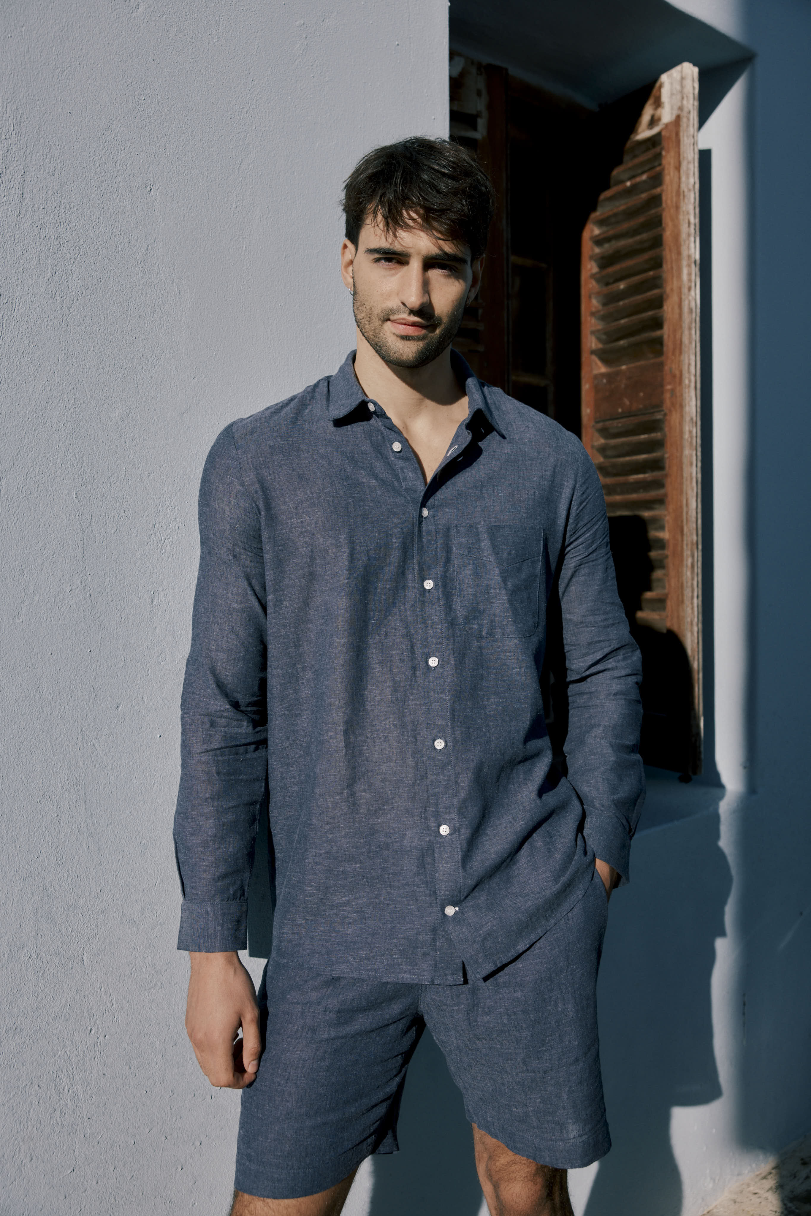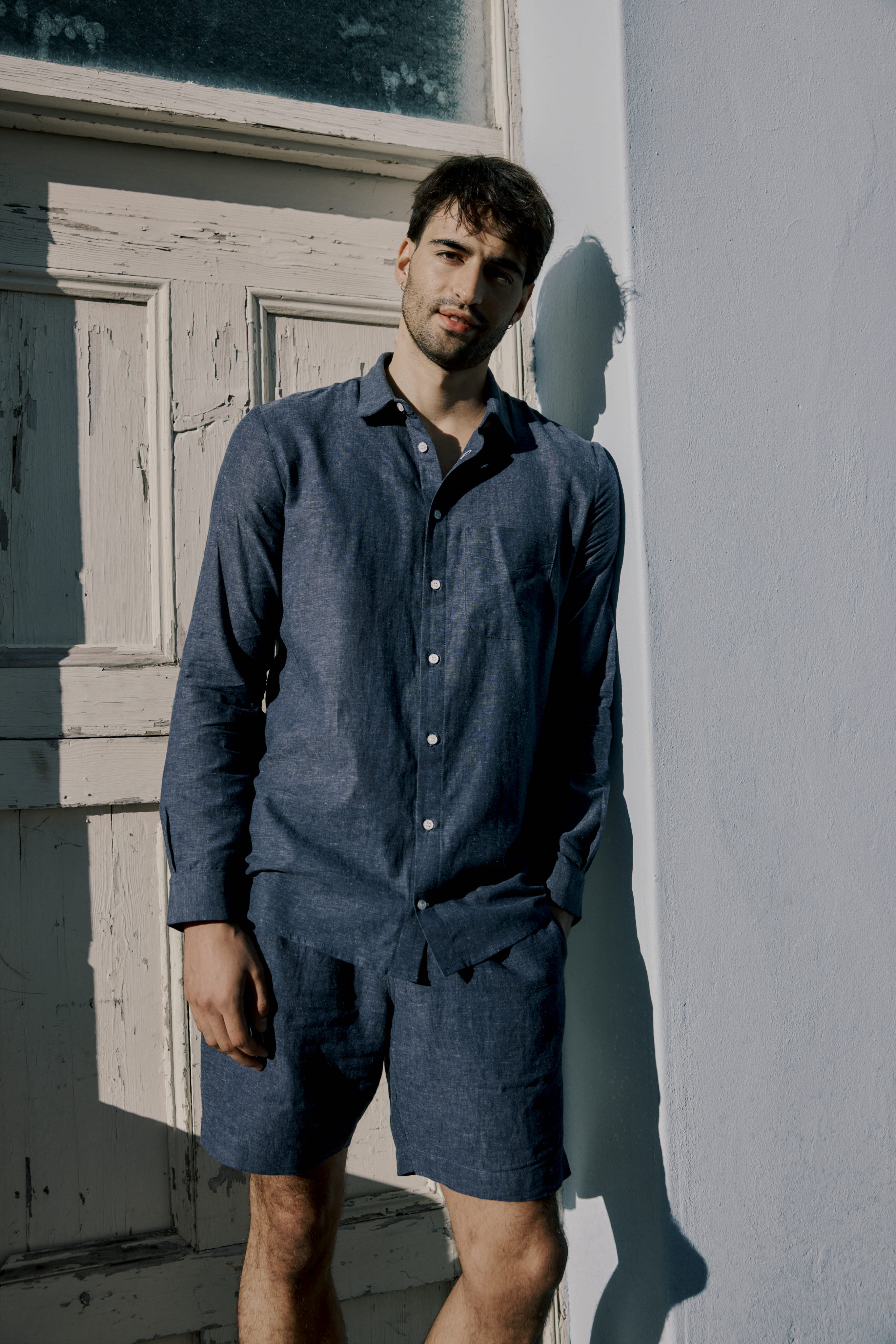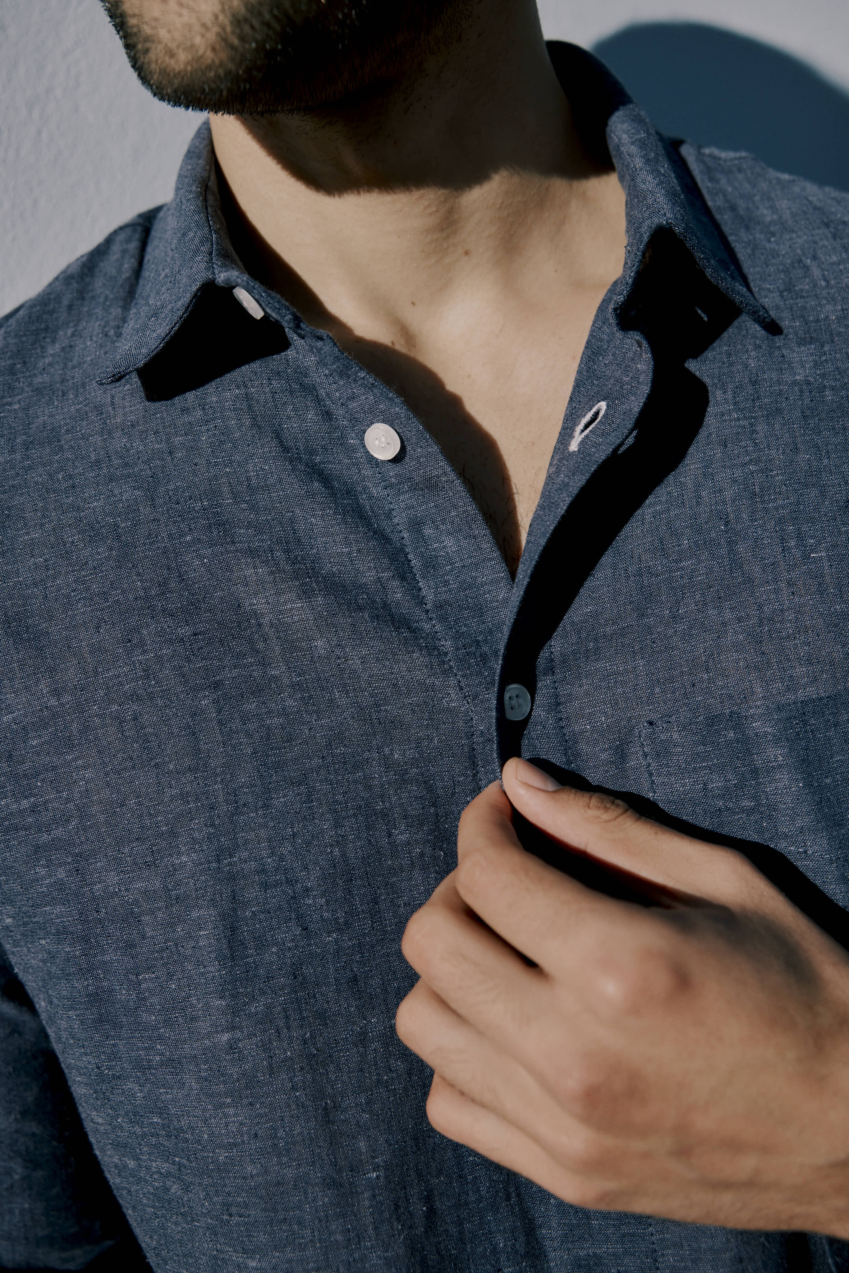Mens slim fit linen shirt with long sleeves, a classic gents collar, and a front patch pocket.