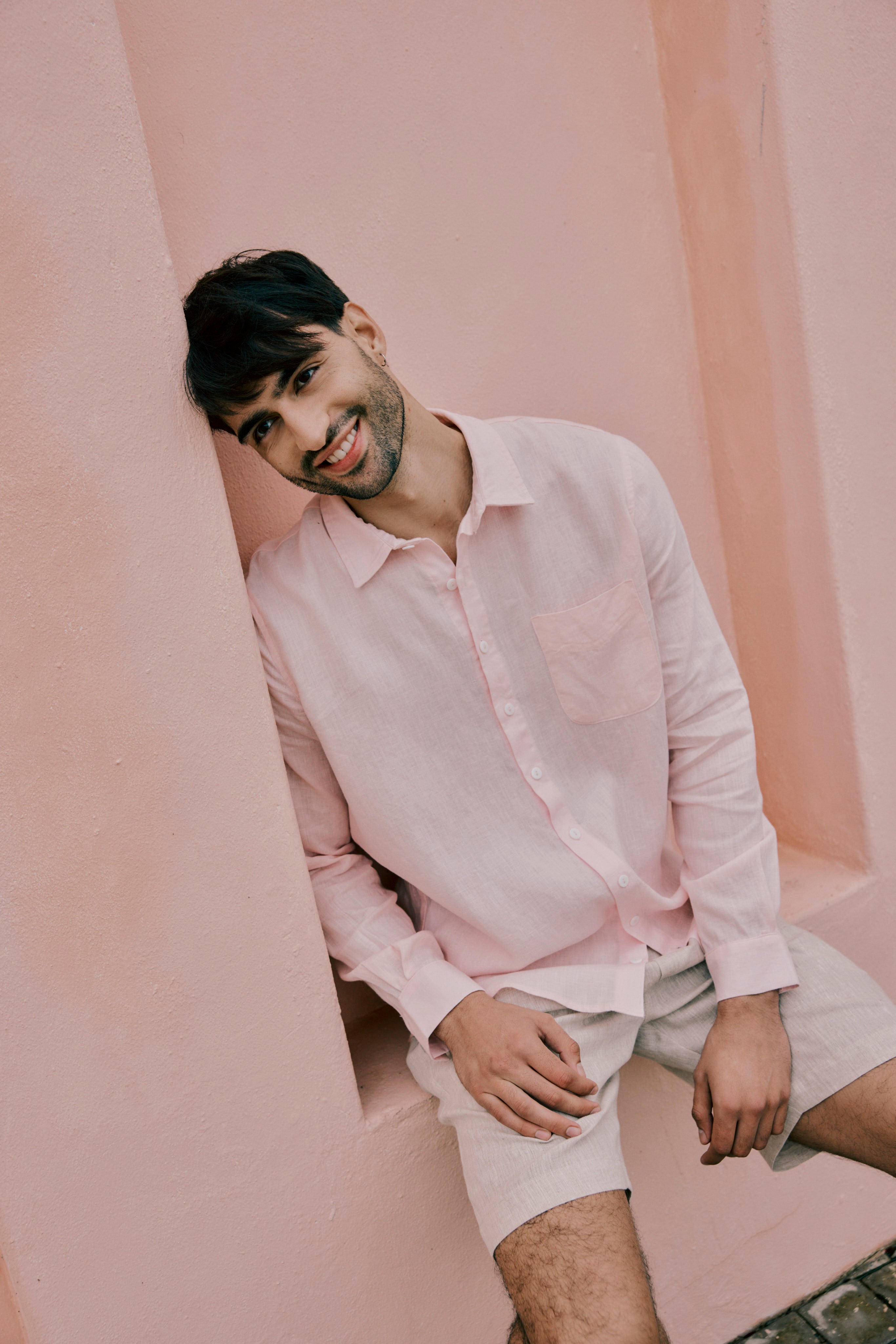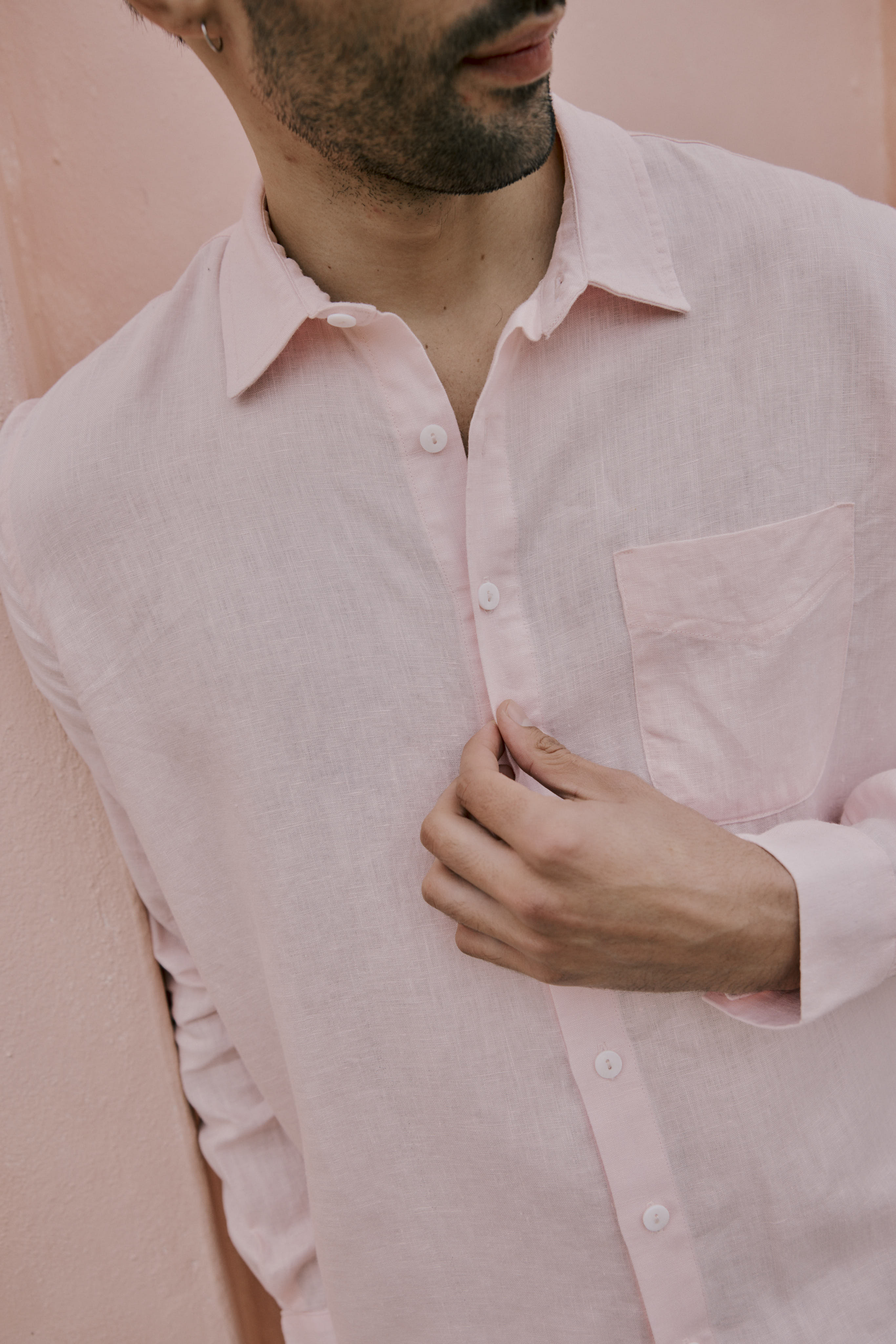 Mens slim fit linen shirt with long sleeves, a classic gents collar, and a front patch pocket.