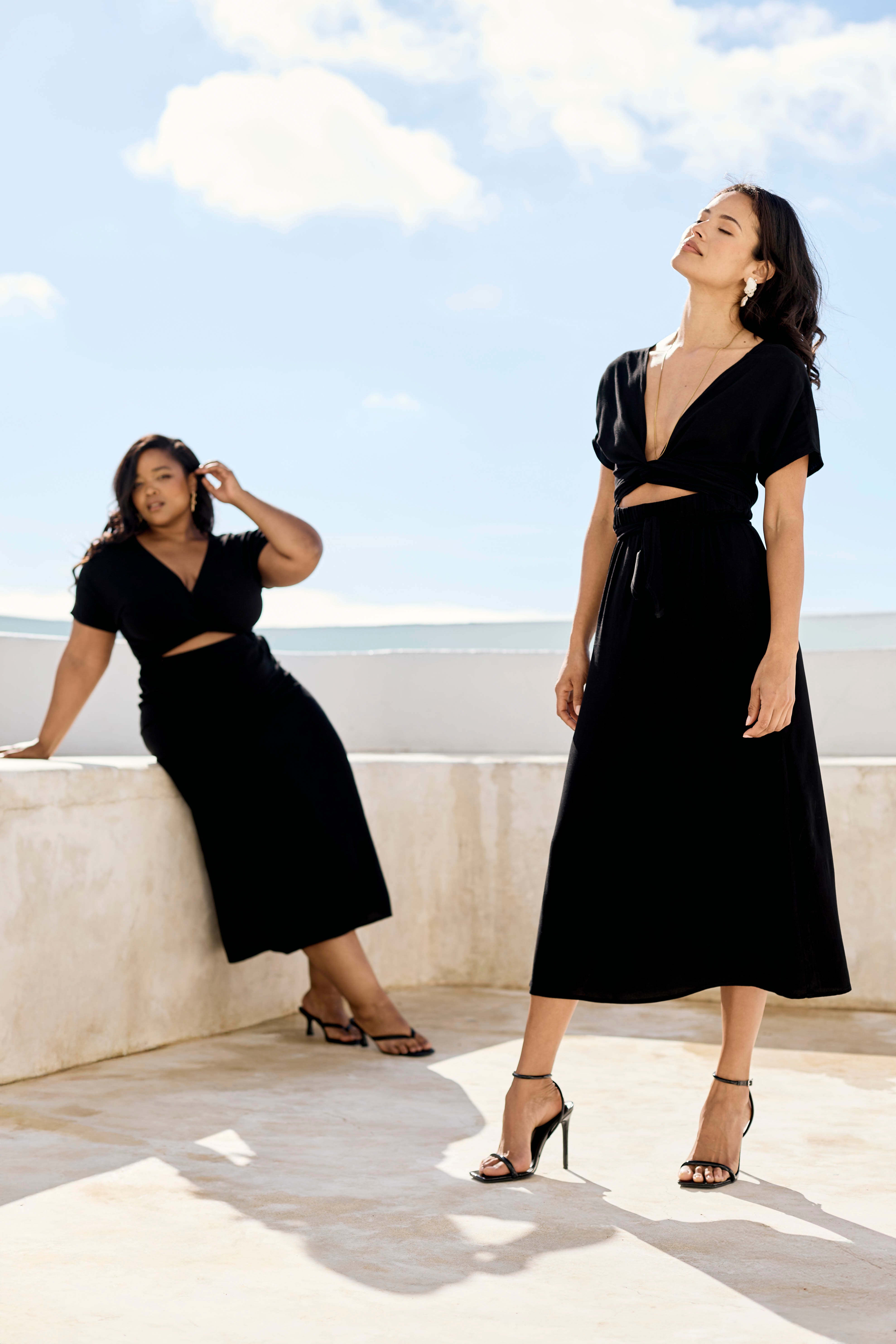 Reversible, wrap, midi length dress with an elasticated waistband and adjustable ties to create the neckline of your choice.