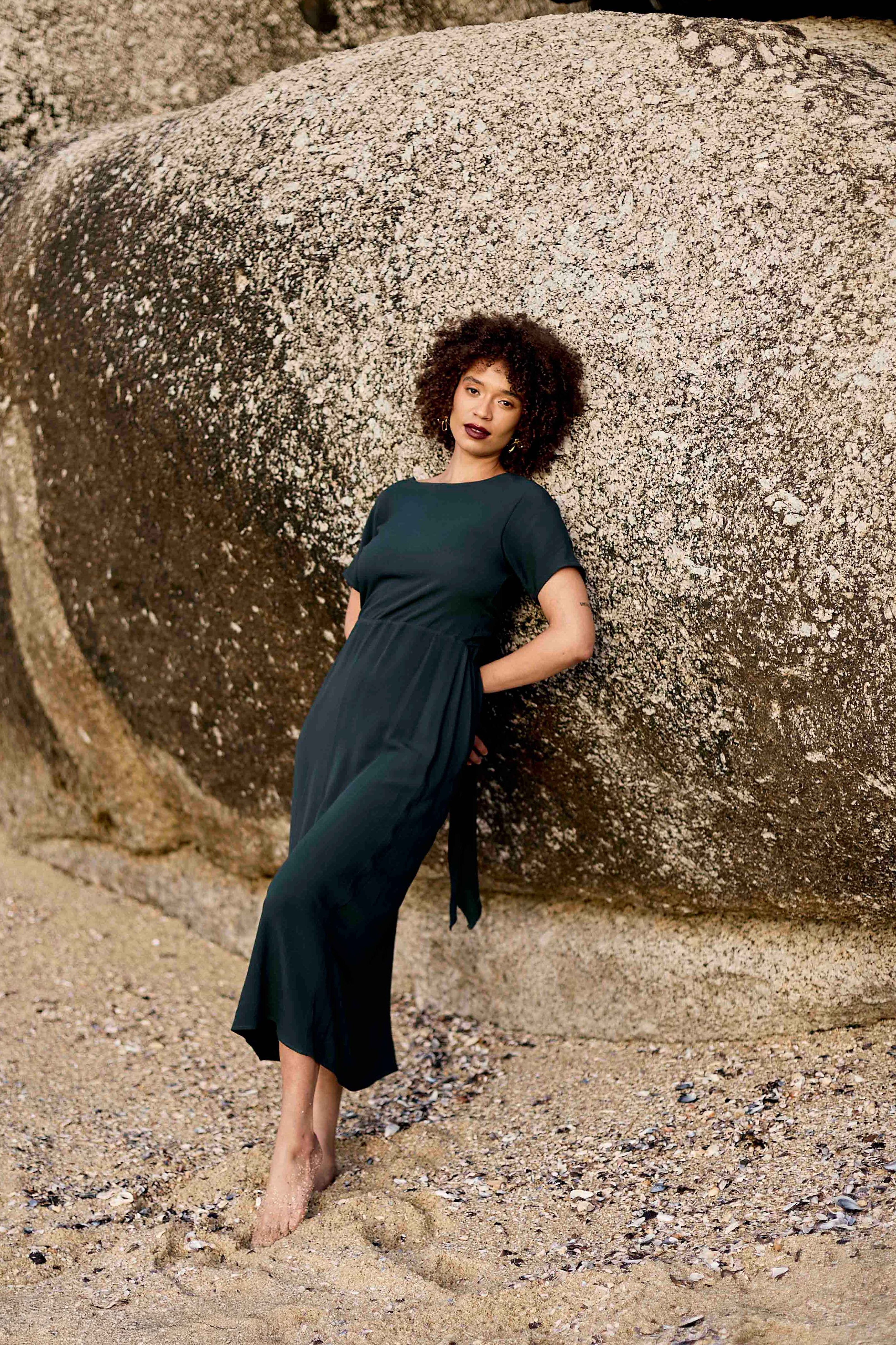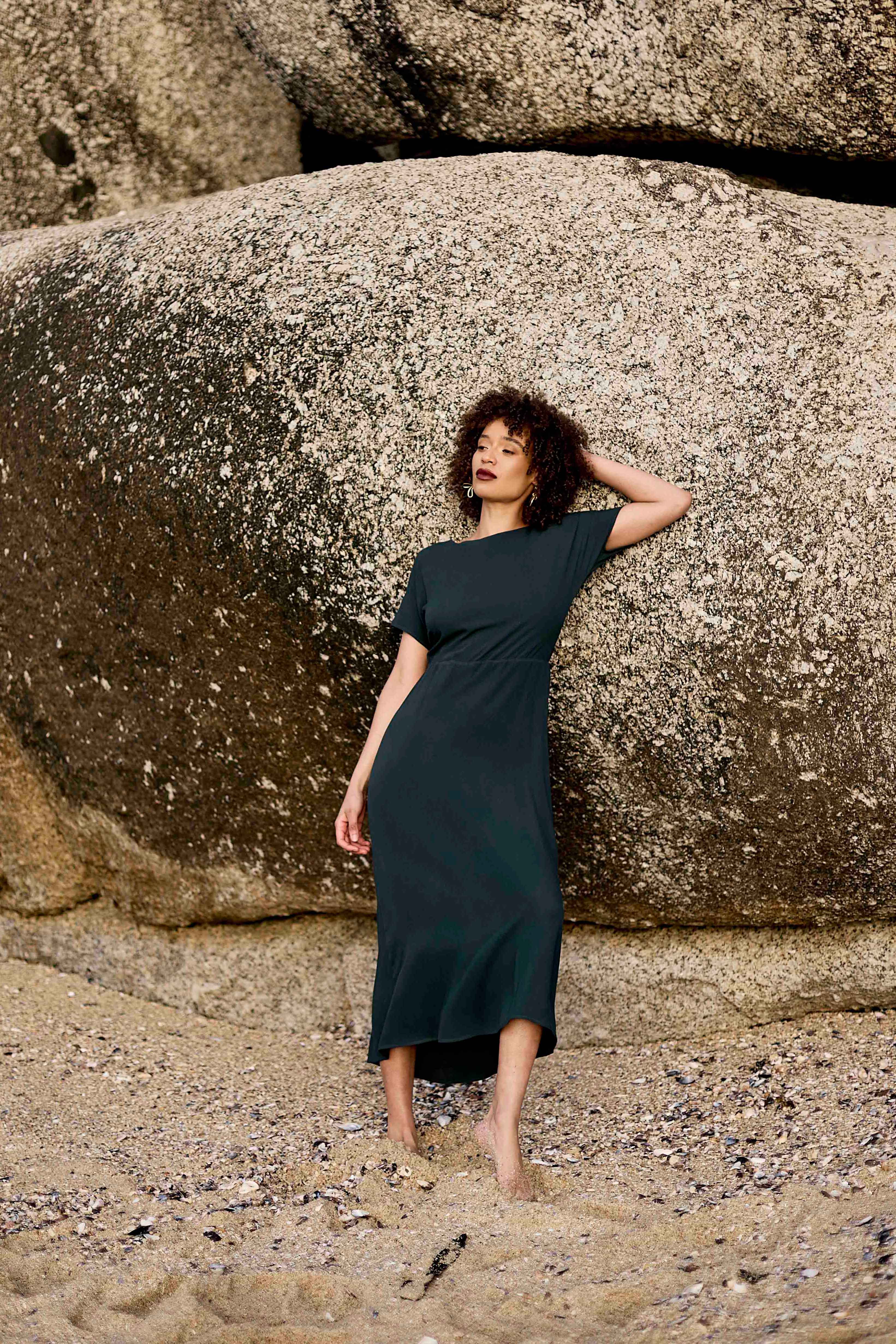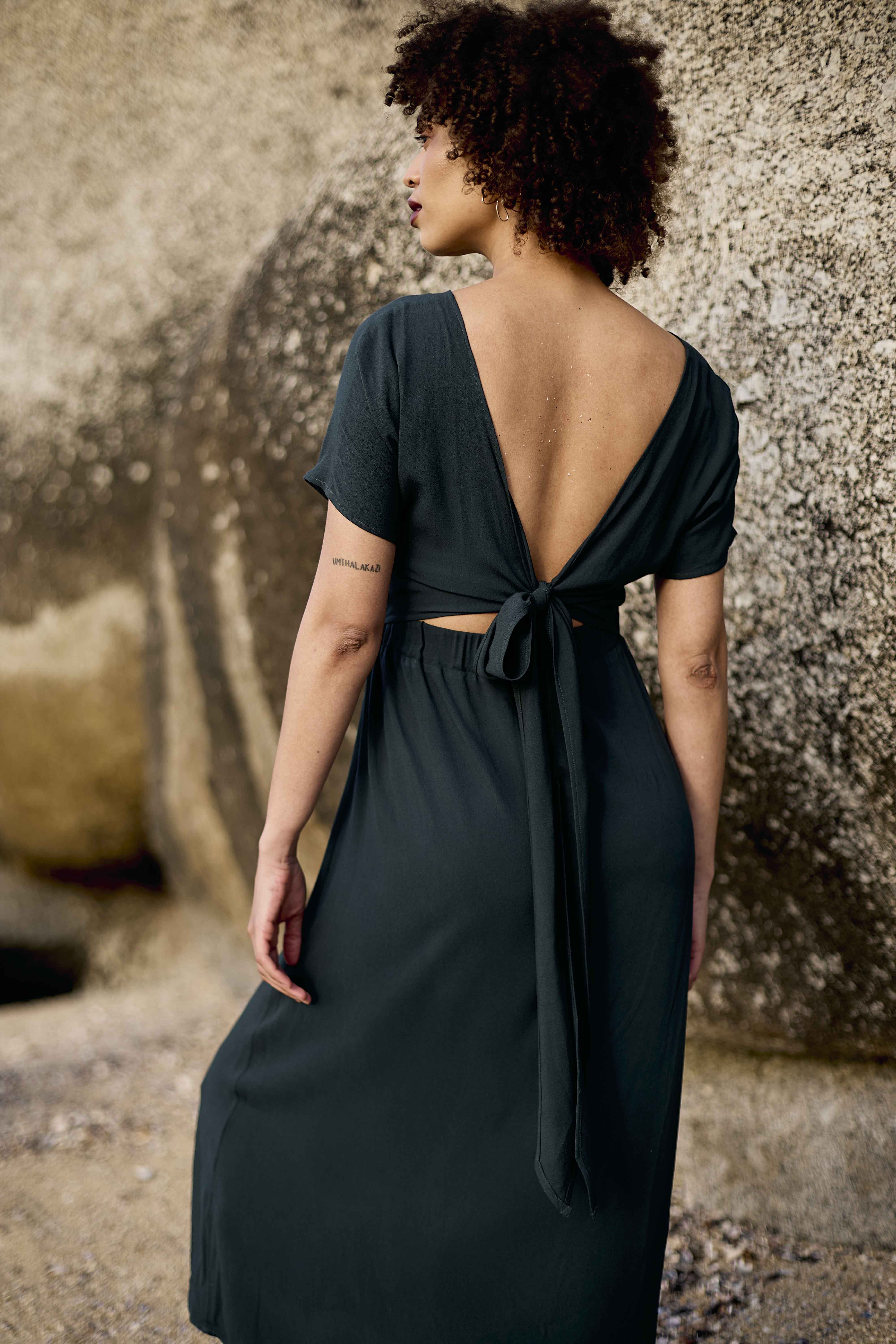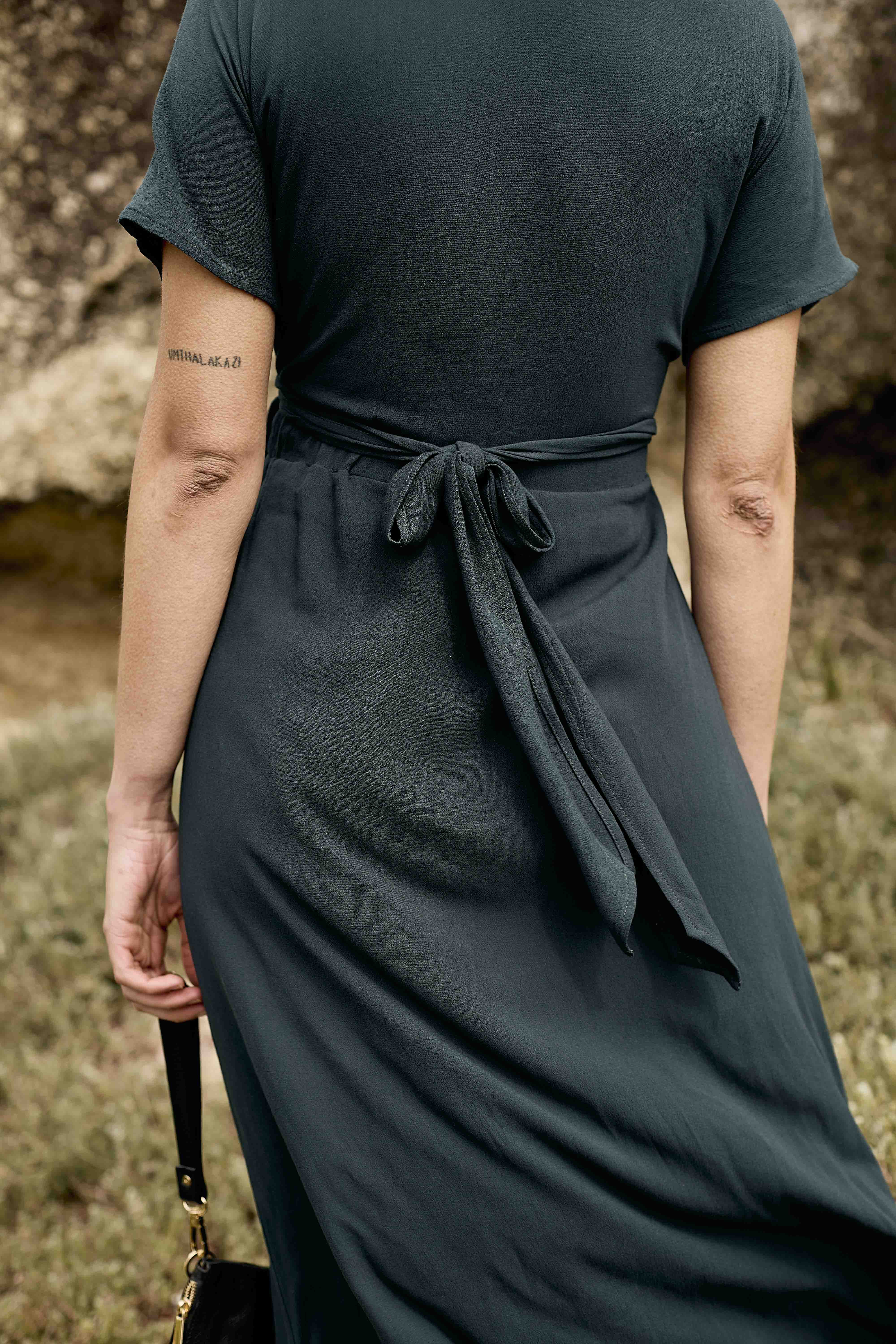 Reversible, wrap, midi length dress with an elasticated waistband and adjustable ties