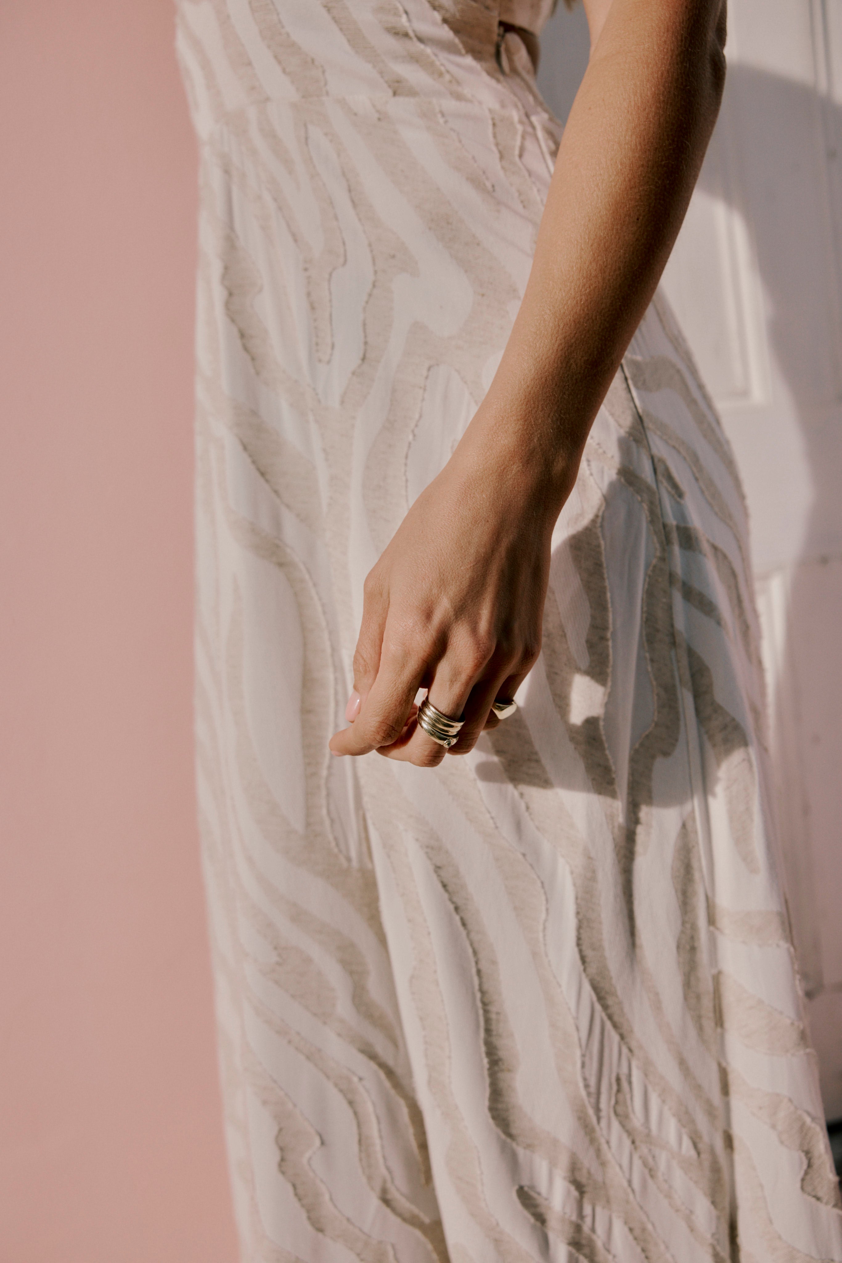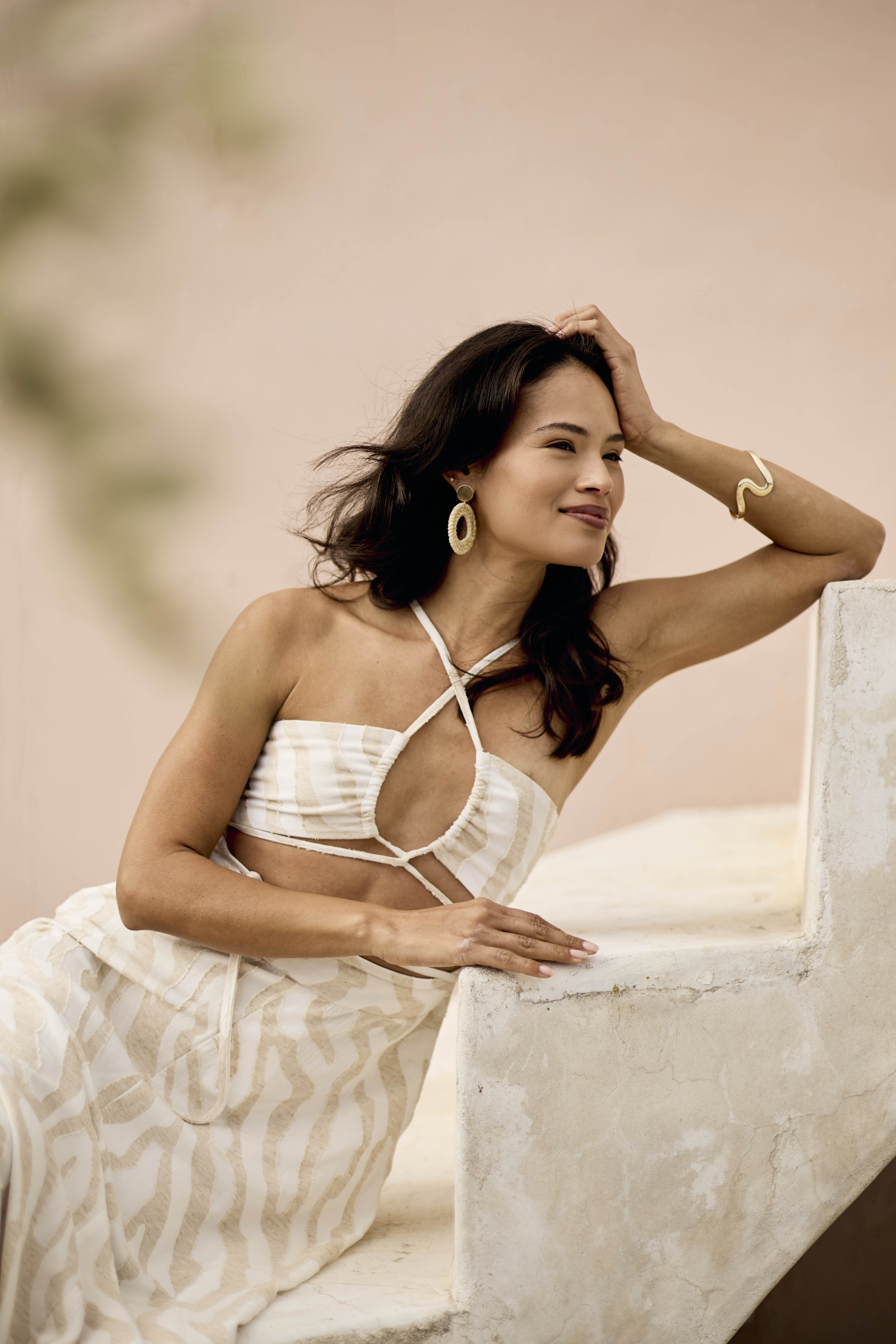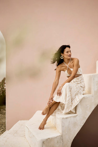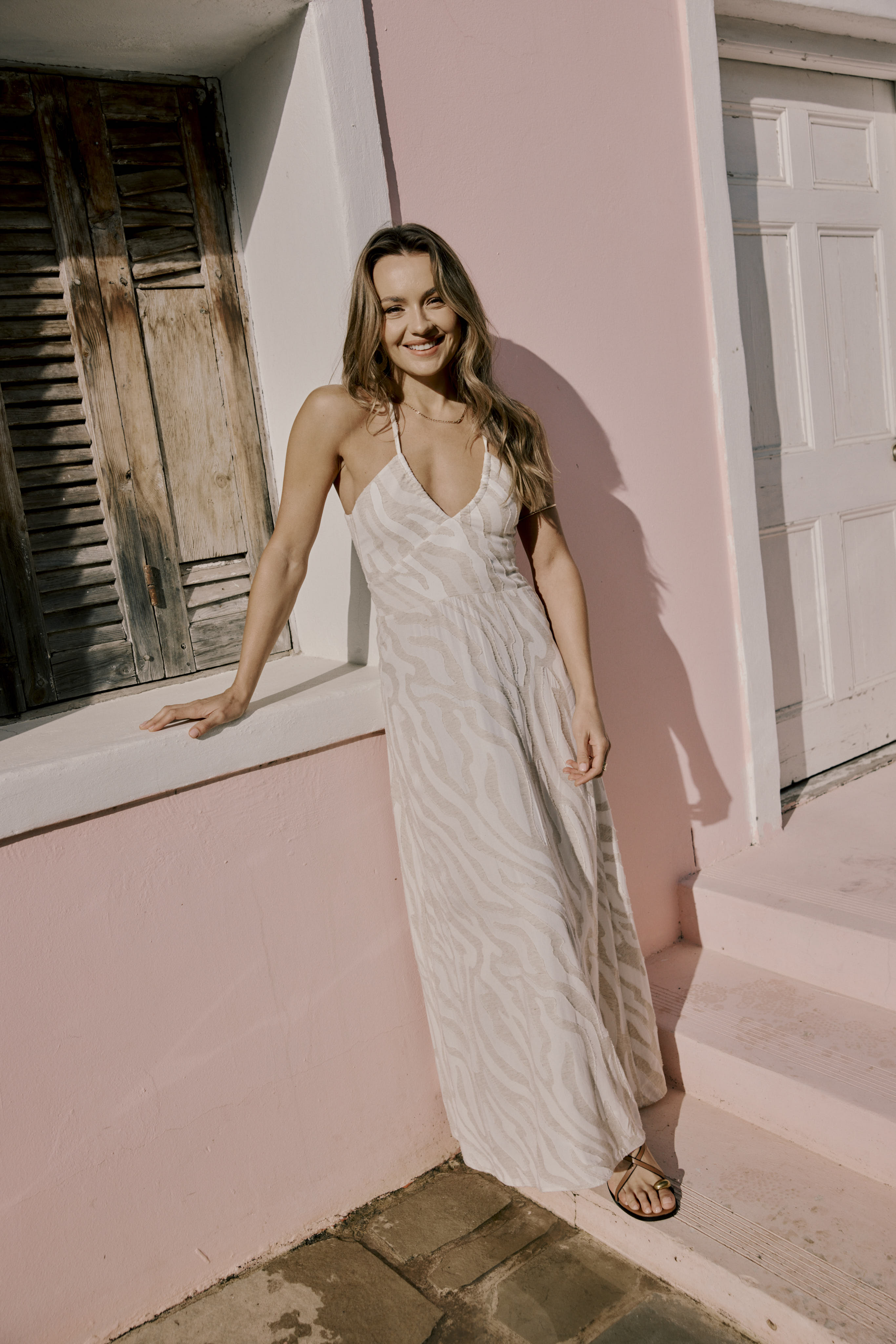 Full length, reversible dress with a flared a-line skirt, unique tie and cross over straps.