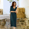 Reversible, sleek pull on midi-length dress with ¾ sleeves.