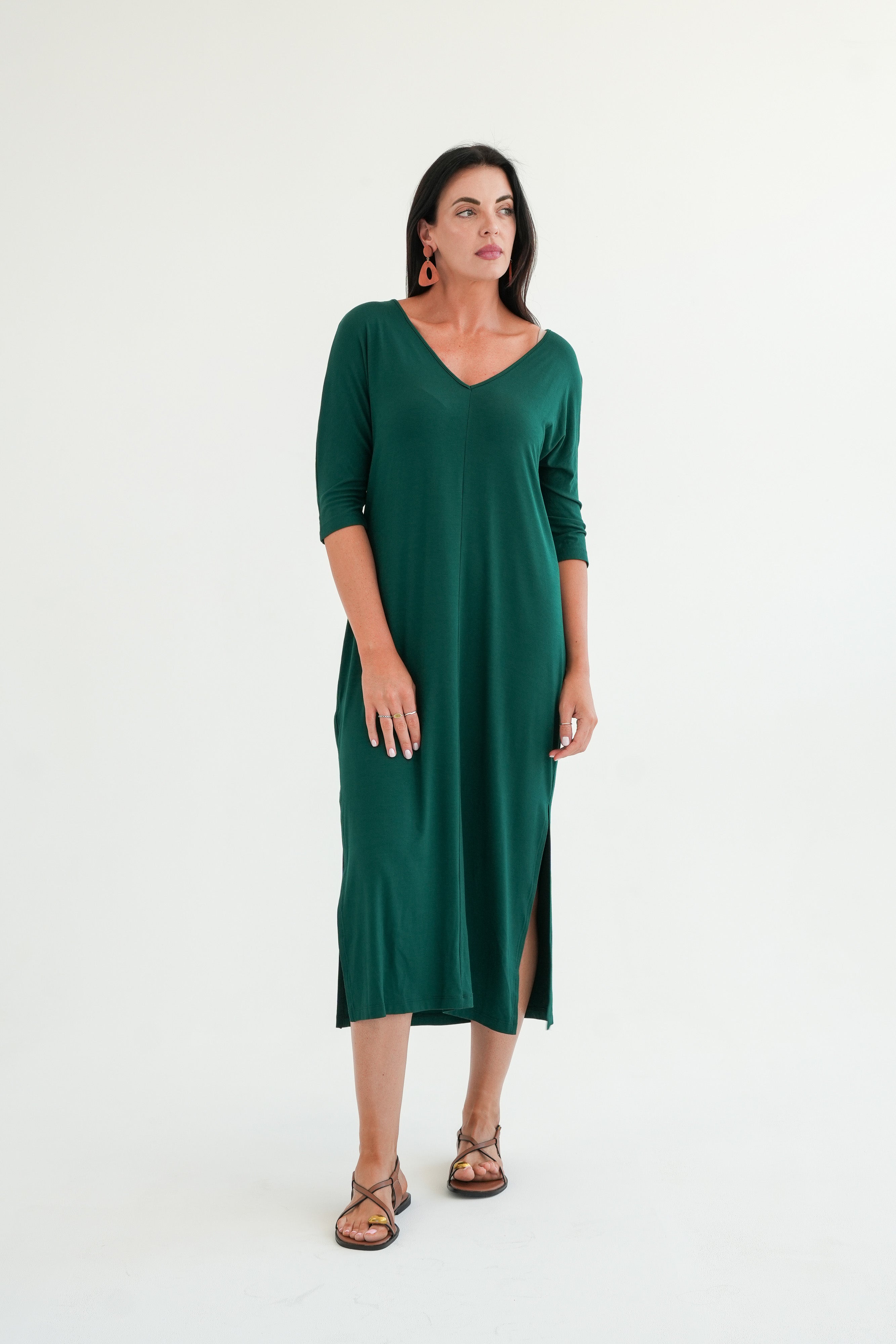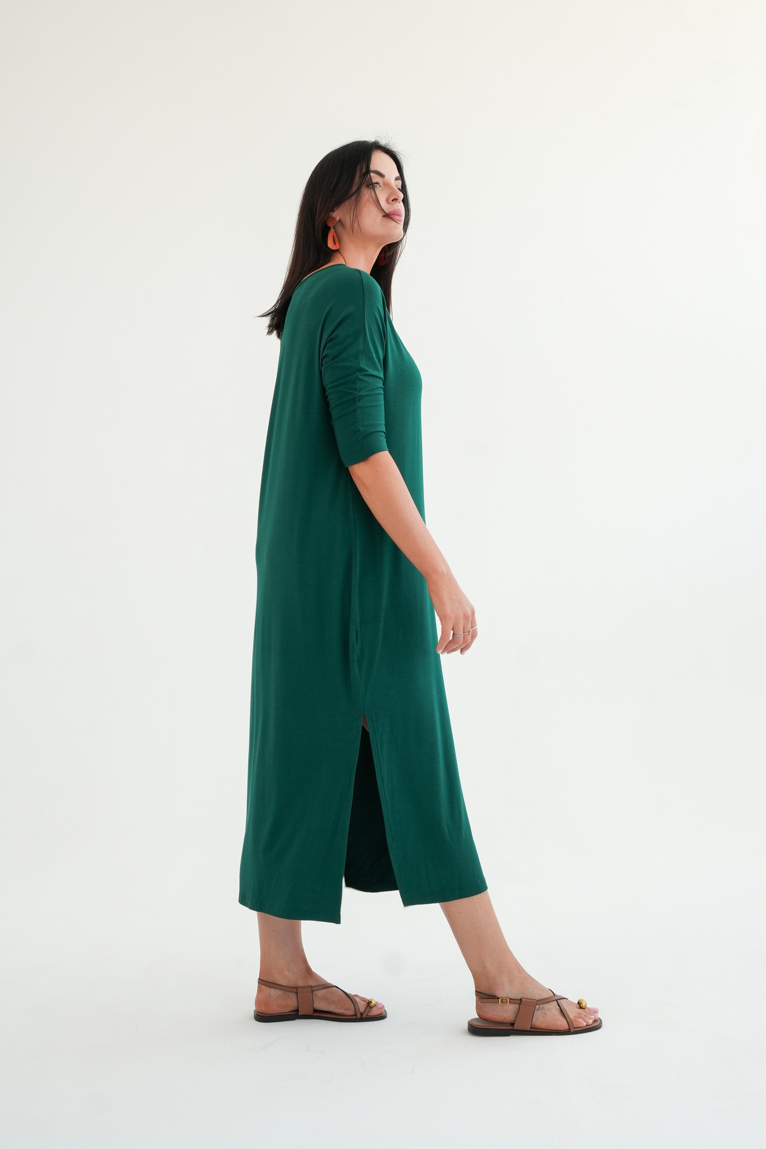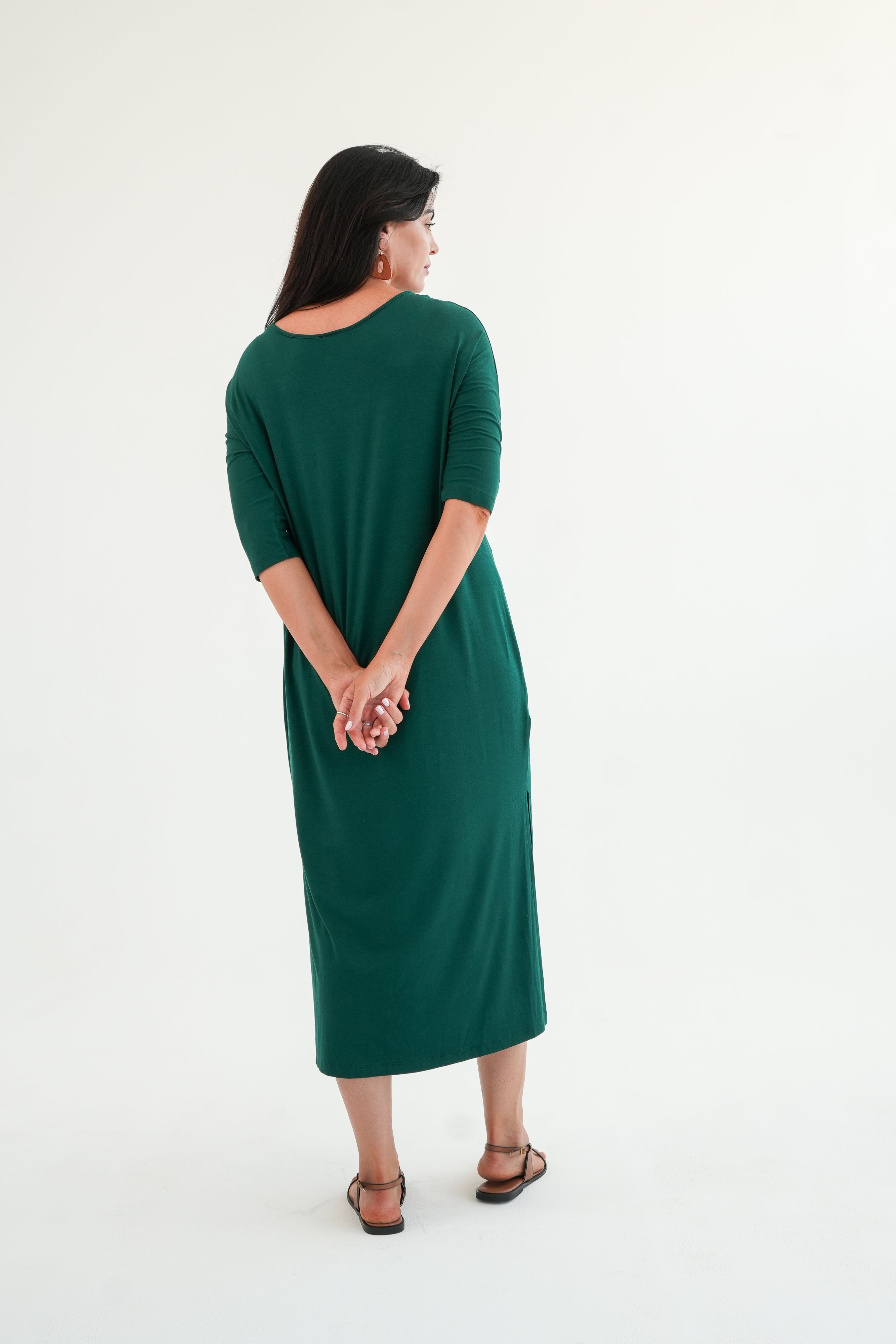 Reversible, sleek pull on midi-length dress with ¾ sleeves.