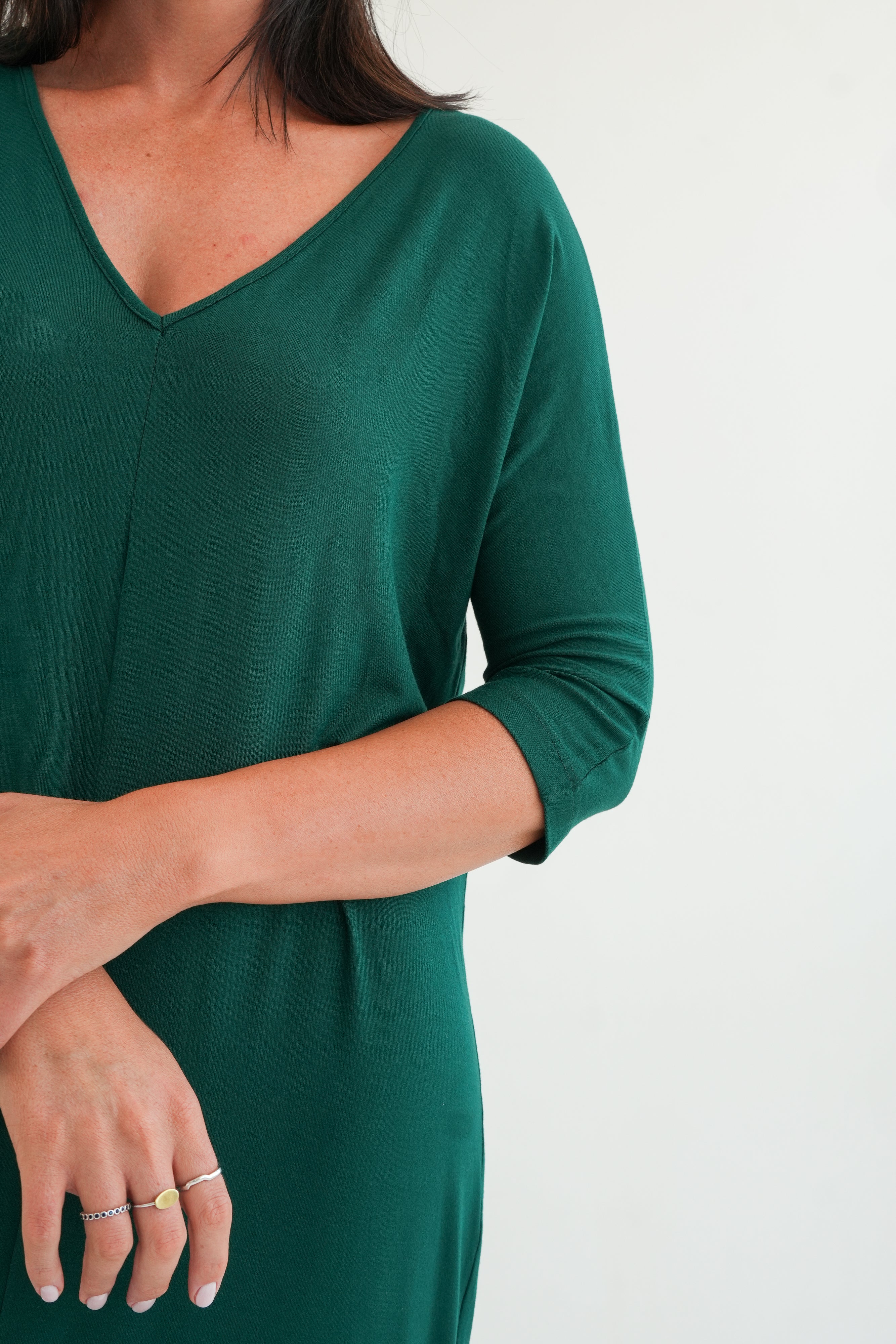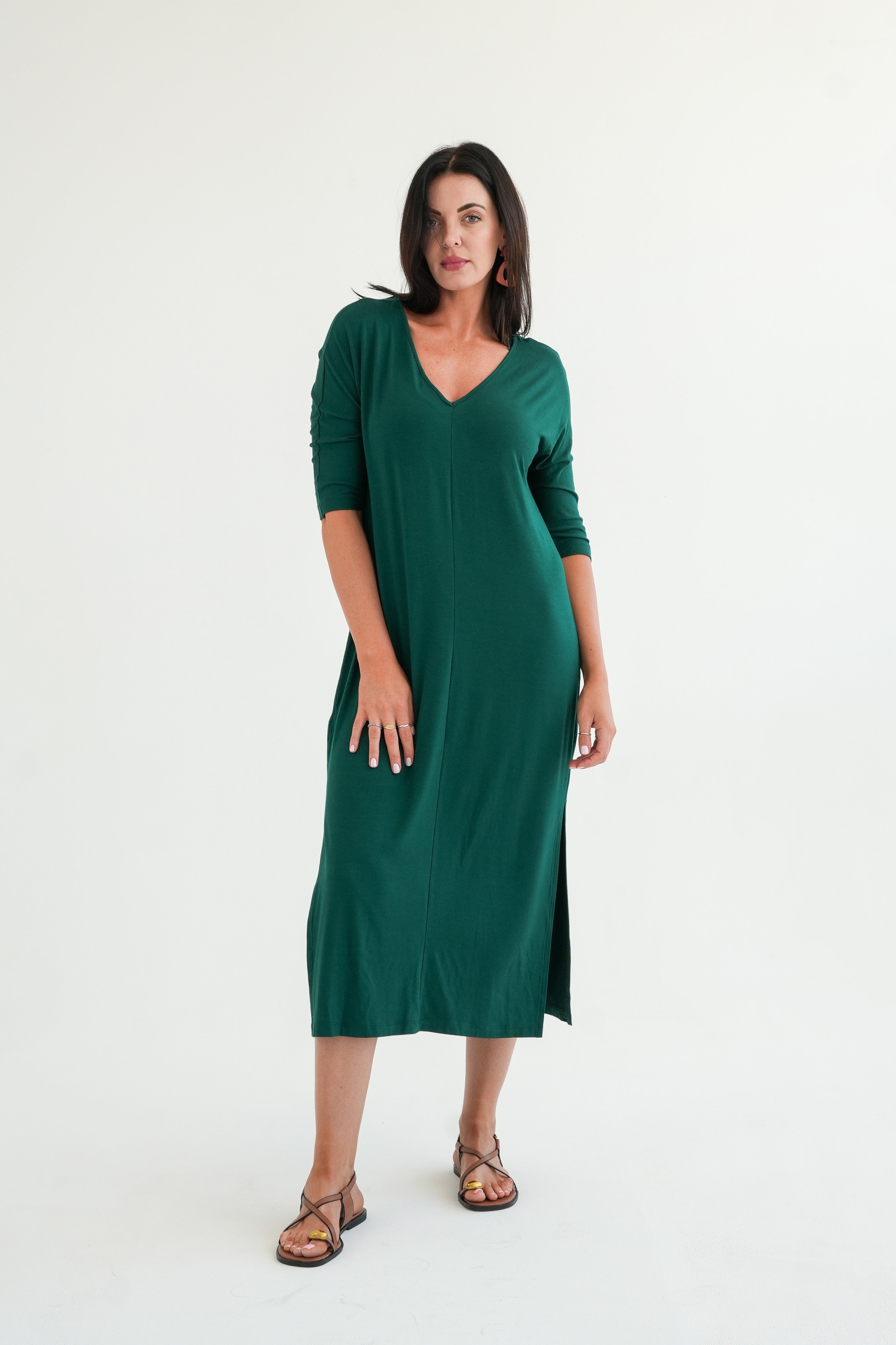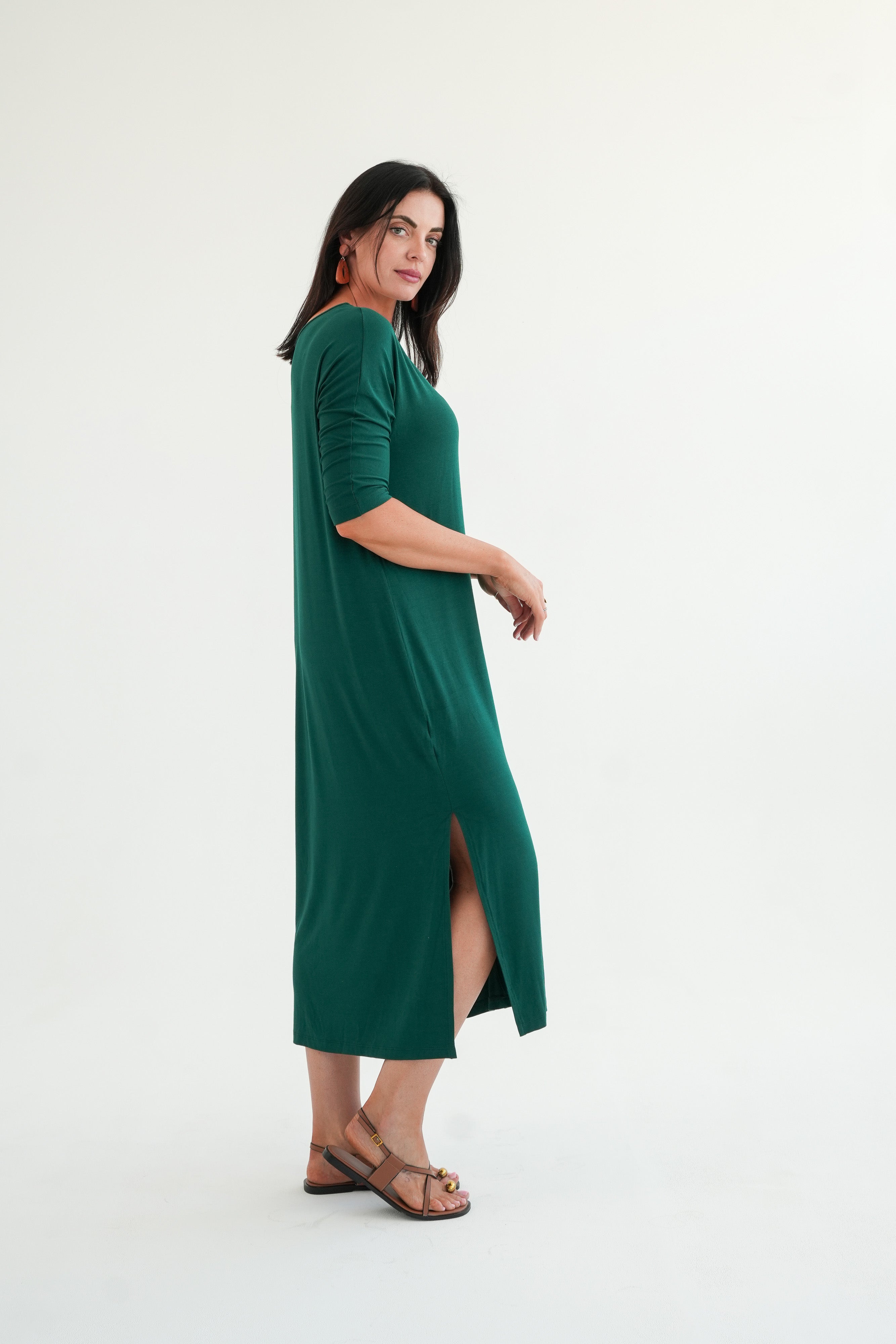 Reversible, sleek pull on midi-length dress with ¾ sleeves.