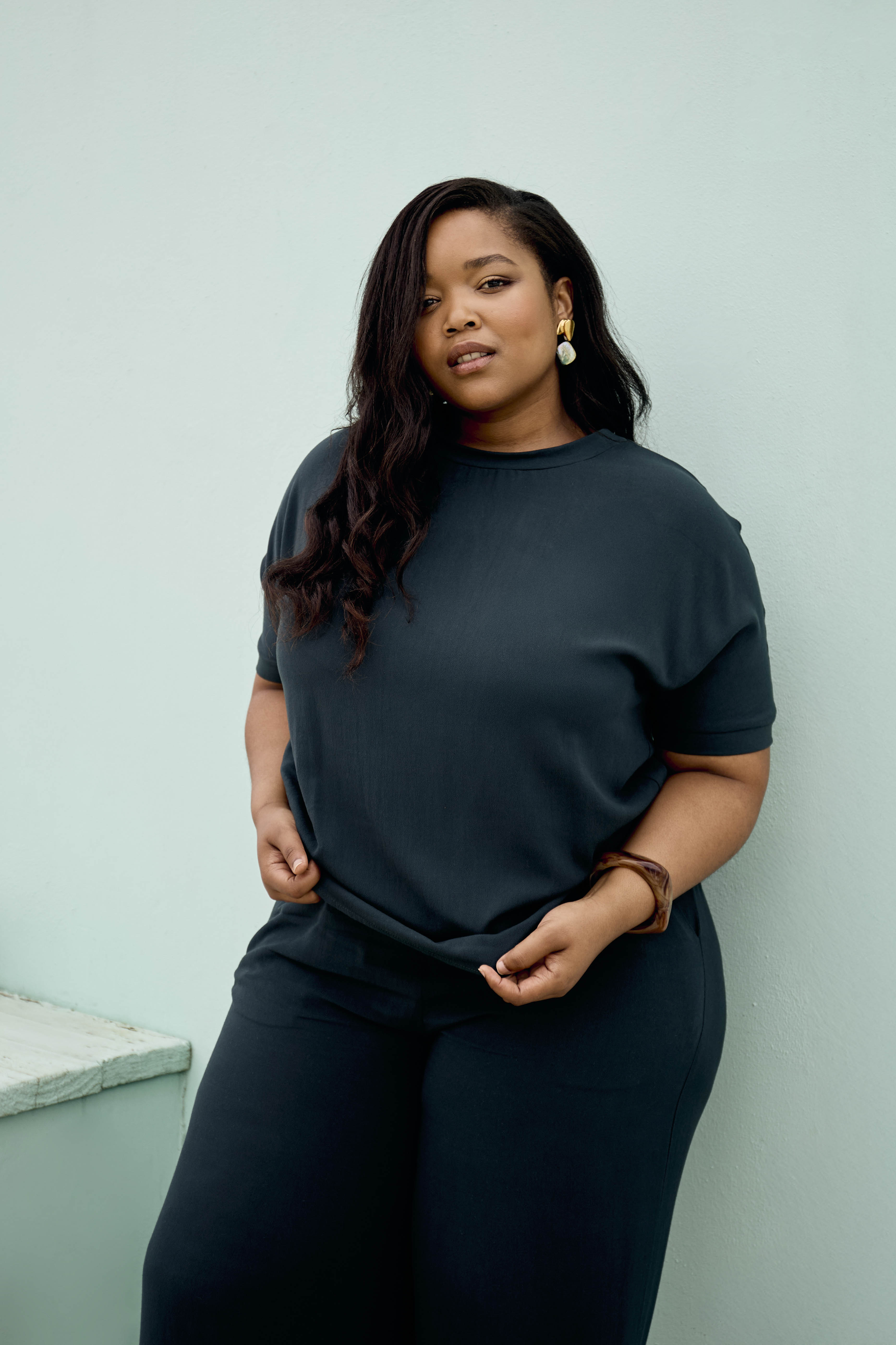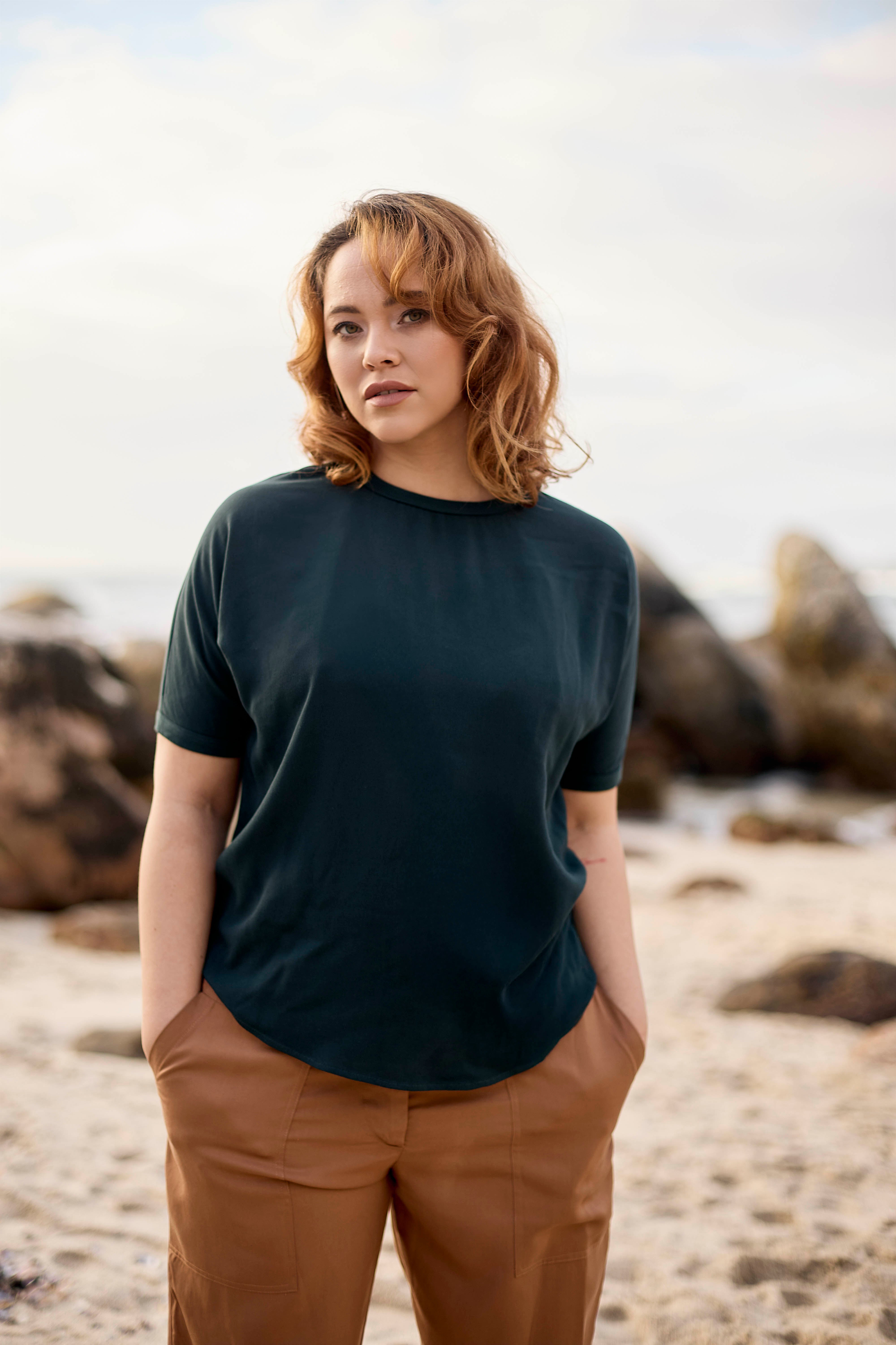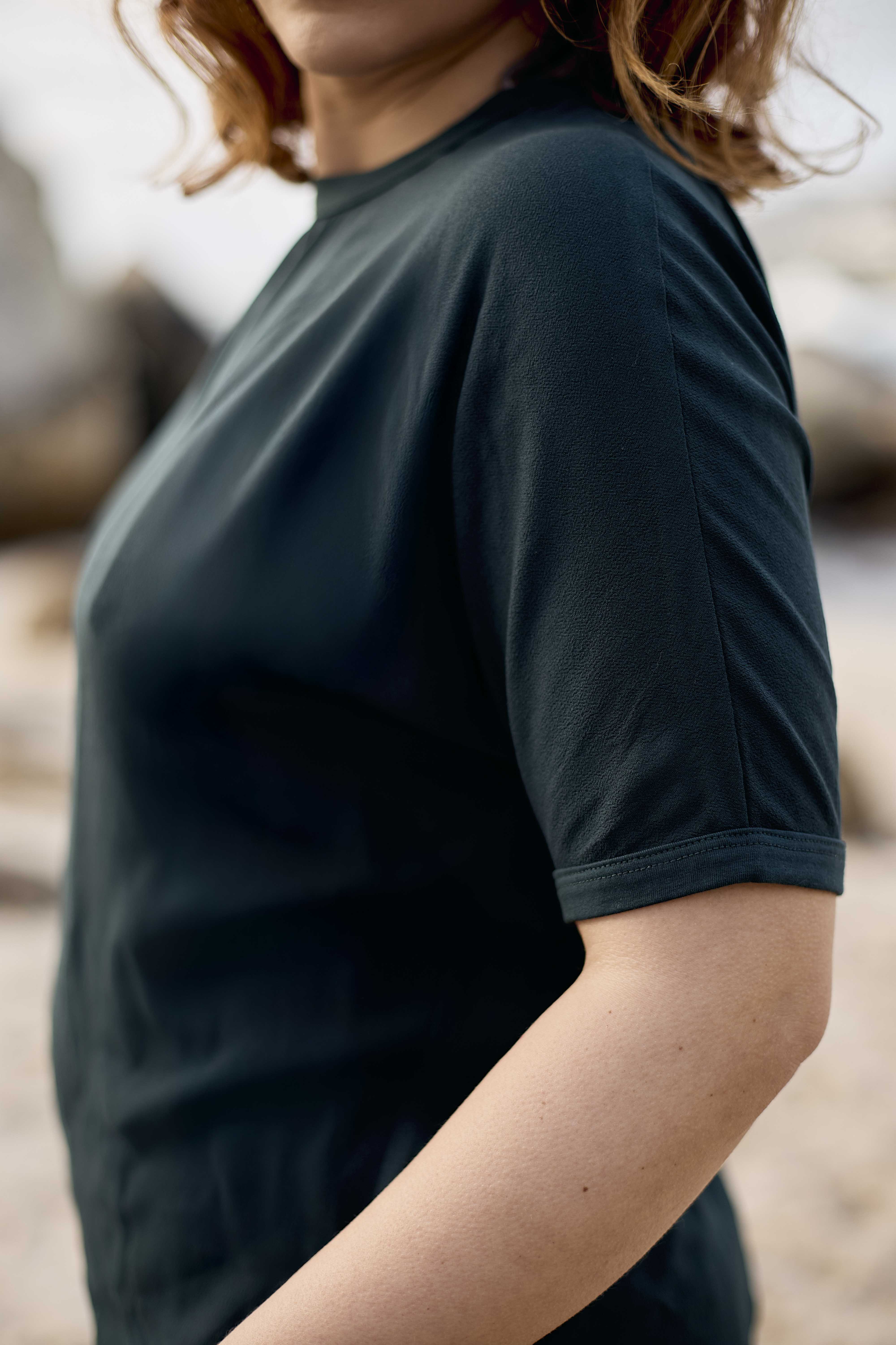 Loose fitting top with t-shirt ribbing on the neck and sleeve hems.